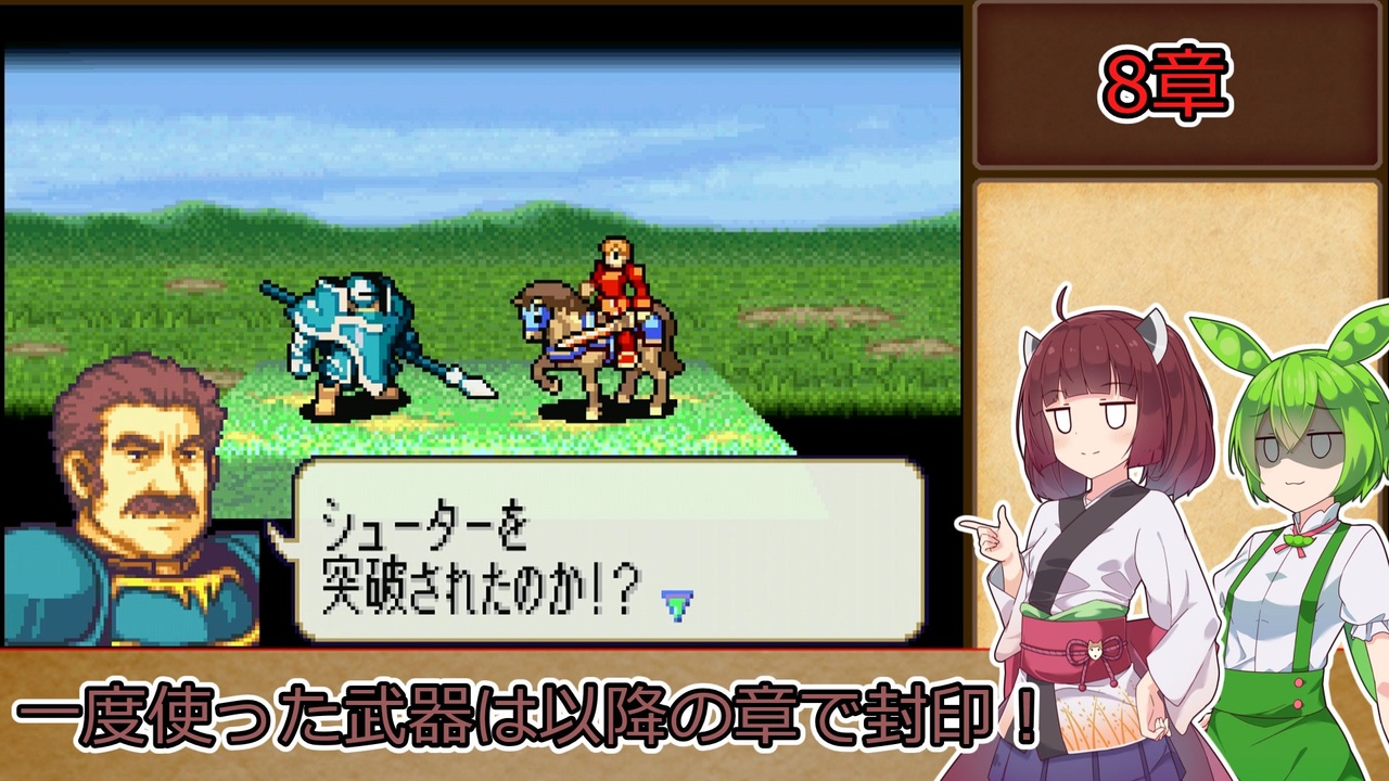 <span style="color: #85200c; font-size: 24px;"><strong><i>・・・まあまあだ。</i></strong></span><br><br><strong>ルール1:一度使用した武器種は、以降の章で使用する事を禁止する。<br>ルール2:武器の使用の定義は『その武器を装備した状態で敵との戦闘が発生したタイミング』『その武器を売却して換金した場合』杖の場合は『対象に対して使用した時点(命中の可否は問わない)』とする。</strong><br><span style="color: #ff0000;"><strong>※同盟軍、演出による戦闘イベントでは使用した判定にはならないこととする。</strong></span><br><strong>ルール3:難易度はリン編ハード→ヘクトル編ハードとする。<br>ルール4:序章から終章まで外伝、異伝を含む全ての章を攻略し、仲間に出来るユニットは全員加入させ、生存させる。(序章と1章のみ同一の章として扱う)</strong><br><span style="color: #ff0000; font-size: 18px;"><strong>※バグ技禁止</strong></span><br><br>本動画のシリーズリスト【<a href="https://www.nicovideo.jp/series/406473" target="_blank" rel="noopener">series/406473</a>】<br>前作の同縛りプレイ【<a href="https://www.nicovideo.jp/series/316824" target="_blank" rel="noopener">series/316824</a>】<br>前:【<a href="https://www.nicovideo.jp/watch/sm42400215" class="watch">sm42400215</a>】次:【<a href="https://www.nicovideo.jp/watch/sm42458582" class="watch">sm42458582</a>】<br><br><strong>使用したソフト</strong><br>VOICEROID+東北きりたんEX<br>VOICEPEAK 東北きりたん<br>VOICEPEAK ずんだもん<br><strong>お借りした素材</strong><br>ニコニコモンズの皆様(コンテンツツリー参照)