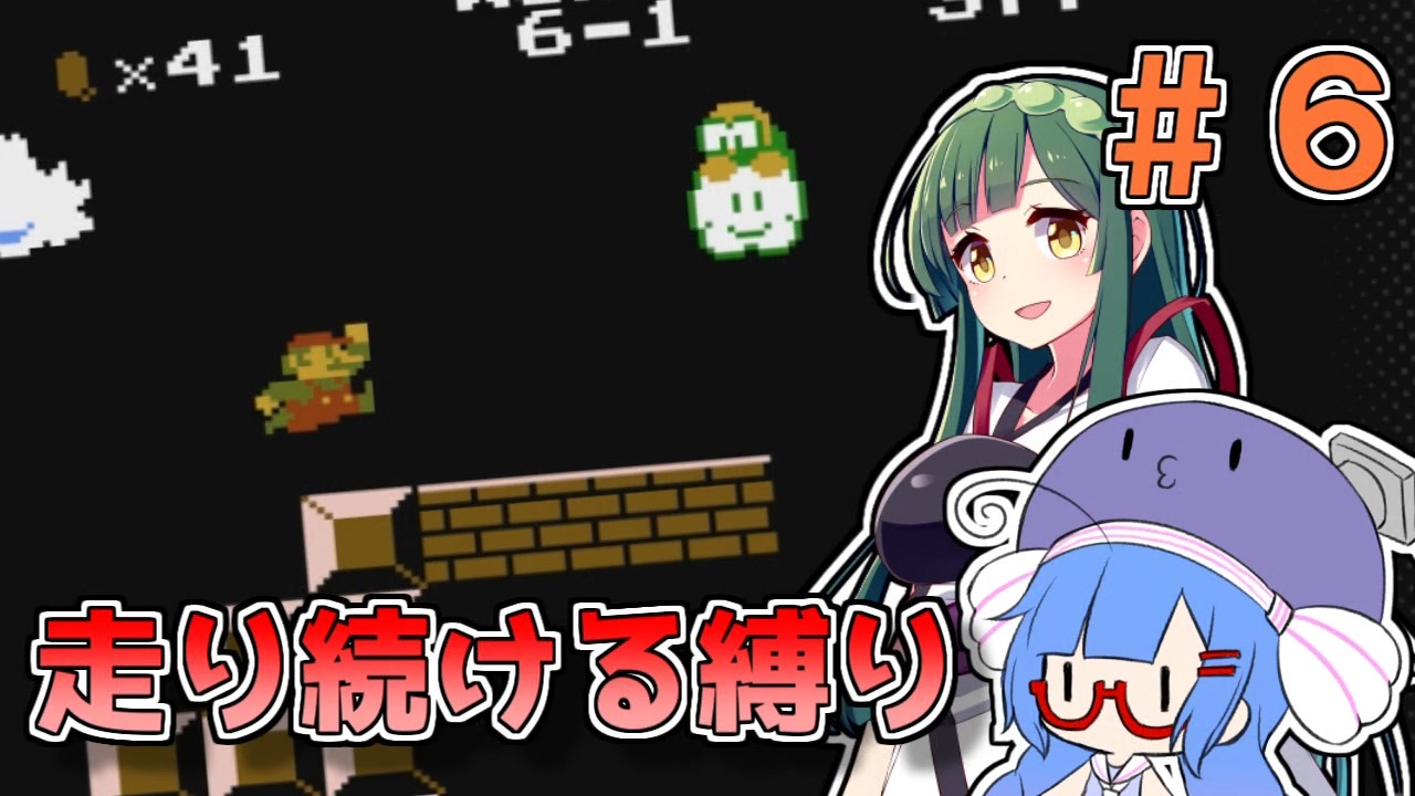 心折れるかと思いました<br><br>初代スーパーマリオブラザーズを走り続ける縛りでプレイしていきます<br><br>■縛り内容<br>・プレイ中は常に十字キー右+Bボタンを押し続ける<br>・壁にぶつかって止まるの禁止<br>・上記の縛りを違反及びミスをした場合、ステージ頭からやり直し(中間地点の使用禁止)<br>・ステージ開始直前にどこでもセーブ使用可<br>※どうしても無理な場合、縛りを緩和します(迷路の城等)<br><br>■プレイ環境<br>Nintendo Switch Online<br><br>■担当<br>実況プレイ担当:東北ずん子<br>ガヤ担当:音街ウナ<br><br>使用させていただいた素材元様<br>blueberry様(東北ずん子立ち絵)<br><a href="https://seiga.nicovideo.jp/seiga/im5774001" target="_blank" rel="noopener nofollow">https://seiga.nicovideo.jp/seiga/im5774001</a><br>空どうふ様(音街ウナ立ち絵)<br><a href="https://seiga.nicovideo.jp/seiga/im8670690" target="_blank" rel="noopener nofollow">https://seiga.nicovideo.jp/seiga/im8670690</a><br>効果音ラボ様<br><a href="https://soundeffect-lab.info/" target="_blank" rel="noopener nofollow">https://soundeffect-lab.info/</a><br>フロップデザイン様(ラノベPOPフォント)<br><a href="https://flopdesign.booth.pm/items/2328262" target="_blank" rel="noopener nofollow">https://flopdesign.booth.pm/items/2328262</a><br>8:51:22 pm様(851フォントシリーズ)<br><a href="http://pm85122.onamae.jp/85122font.html" target="_blank" rel="noopener nofollow">http://pm85122.onamae.jp/85122font.html</a><br>ニコニコモンズの素材主様<br><br>twitter<br><a href="https://twitter.com/amanojakuSweets" target="_blank" rel="noopener nofollow">https://twitter.com/amanojakuSweets</a><br><br>前回 → <a href="https://www.nicovideo.jp/watch/sm42264077" class="watch">sm42264077</a><br>次回 → <a href="https://www.nicovideo.jp/watch/sm42561329" class="watch">sm42561329</a><br><br>走り続けるマリオマイリスト → <a href="https://www.nicovideo.jp/mylist/74622299" target="_blank" rel="noopener">mylist/74622299</a><br>単発動画マイリスト → <a href="https://www.nicovideo.jp/mylist/71749823" target="_blank" rel="noopener">mylist/71749823</a>