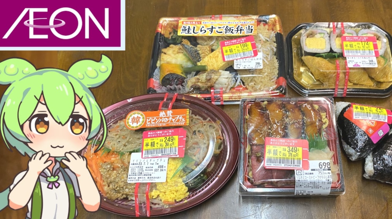 イオンで買ってきた半額弁当です。<br><br><br><br>【使用した素材】(※敬称略)<br>(合成音声)VOICEVOX/ずんだもん/四国めたん<br><a href="https://voicevox.hiroshiba.jp/" target="_blank" rel="noopener nofollow">https://voicevox.hiroshiba.jp/</a><br>(立ち絵)坂本アヒル<br><a href="https://seiga.nicovideo.jp/seiga/im10788496" target="_blank" rel="noopener">im10788496</a>/<a href="https://seiga.nicovideo.jp/seiga/im10791276" target="_blank" rel="noopener">im10791276</a><br>(楽曲)甘茶の音楽工房/「楽しい麦畑」<br><a href="https://amachamusic.chagasi.com/" target="_blank" rel="noopener nofollow">https://amachamusic.chagasi.com/</a><br><br><br>【関連動画】<br>トップバリュの黄色いヤツの『おにぎり』<br><a href="https://www.youtube.com/watch?v=HleKmhF7D-o&ab_channel=maryu4492" target="_blank" rel="noopener nofollow">https://www.youtube.com/watch?v=HleKmhF7D-o&ab_channel=maryu4492</a><br><br>