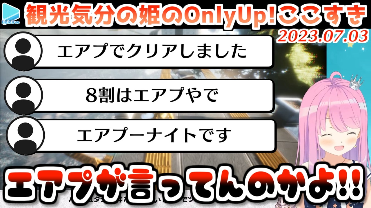 姫をキレさせたら大したもんですよ<br><br><a href="#" class="seekTime" data-seekTime="00:00" onclick="seekNicoPlayer('#00:00'); return false;">#00:00</a> 観光気分の姫<br><a href="#" class="seekTime" data-seekTime="01:11" onclick="seekNicoPlayer('#01:11'); return false;">#01:11</a> 落下集<br><a href="#" class="seekTime" data-seekTime="02:15" onclick="seekNicoPlayer('#02:15'); return false;">#02:15</a> エアプーナイト<br><a href="#" class="seekTime" data-seekTime="02:53" onclick="seekNicoPlayer('#02:53'); return false;">#02:53</a> 地上へ<br><a href="#" class="seekTime" data-seekTime="03:46" onclick="seekNicoPlayer('#03:46'); return false;">#03:46</a> リコーダー<br><a href="#" class="seekTime" data-seekTime="04:59" onclick="seekNicoPlayer('#04:59'); return false;">#04:59</a> 心音?<br><a href="#" class="seekTime" data-seekTime="05:38" onclick="seekNicoPlayer('#05:38'); return false;">#05:38</a> イライラしないのら<br><br>元動画様はこちら<br>【 Only Up! 】姫様は高所恐怖症…?!初挑戦してみるのらぞぃ【姫森ルーナ/ホロライブ】<br><a href="https://youtu.be/QieYc921PXA" target="_blank" rel="noopener nofollow">https://youtu.be/QieYc921PXA</a><br><br>【#大空スバル生誕祭2023】おたんじょうび【ホロライブ/大空スバル】<br><a href="https://youtu.be/HfzH5gC7gic" target="_blank" rel="noopener nofollow">https://youtu.be/HfzH5gC7gic</a><br><br>【 Minecraft 】 んな電鉄~~快速編なのら!【姫森ルーナ/ホロライブ】2023/06/12<br><a href="https://youtu.be/VGzqKerlZDo" target="_blank" rel="noopener nofollow">https://youtu.be/VGzqKerlZDo</a><br><br>【 スプラトゥーン3 前夜祭 】新武器「弓」が追加?!リハビリ兼ねて遊んでみるのら!!~Splatoon3【姫森ルーナ/ホロライブ】2022/08/28<br><a href="https://youtu.be/NlngdSRNmoM?t=1467" target="_blank" rel="noopener nofollow">https://youtu.be/NlngdSRNmoM?t=1467</a><br><br>【 #なのらいぶ 】GeoGuessr で目指せ0mなのら!【姫森ルーナ/ホロライブ】2023/02/01<br><a href="https://youtu.be/ElyDv2VJO-o?t=5451" target="_blank" rel="noopener nofollow">https://youtu.be/ElyDv2VJO-o?t=5451</a><br><br>【 FC版:スーパーマリオUSA 】#1 今までのマリオと何かが違うっ…?!のら?!【姫森ルーナ/ホロライブ】2023/02/20<br><a href="https://youtu.be/8NU9YYm5DQI?t=7706" target="_blank" rel="noopener nofollow">https://youtu.be/8NU9YYm5DQI?t=7706</a><br><br>Luna Ch. 姫森ルーナ <a href="https://t.co/65lIXbf9zT" target="_blank" rel="noopener nofollow">https://t.co/65lIXbf9zT</a><br /><span style="color: #b7b7b7; font-size: 10px;">ホロライブ切り抜き/なめたけ <a href="https://t.co/CBwJLnYR2c" target="_blank" rel="noopener nofollow">https://t.co/CBwJLnYR2c</a></span>