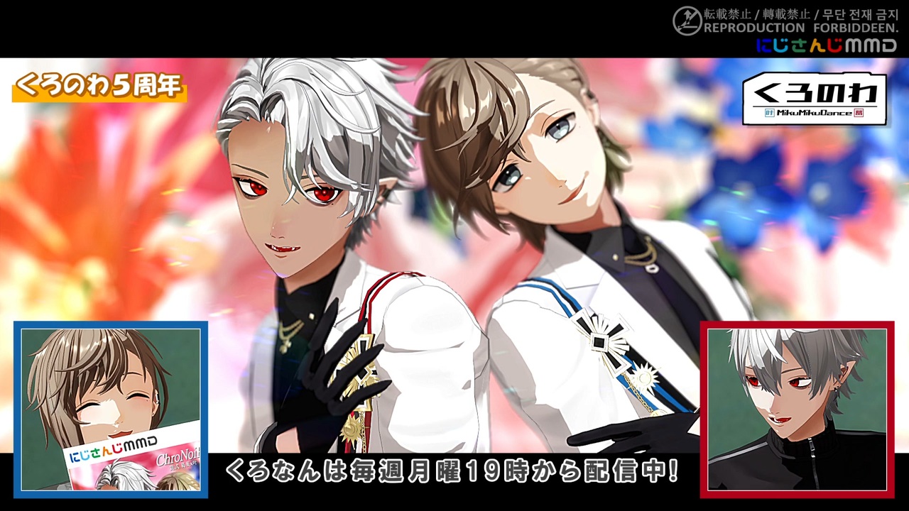 <span style="color: #ff0000;"><strong>ChroNoiR5周年おめでとうございます!!</strong></span><br>お祝いの気持ちを込めてまたまたMMDでCMパロ作りました☆<br>相変わらずのヘッポコトレースですが少しでも楽しんでいただけたら幸いです。<br><br>トレース元:auひかり 高松チャンネル 「ずーっと」篇<br><a href="https://www.au.com/pr/cm/takasugikun/" target="_blank" rel="noopener nofollow">https://www.au.com/pr/cm/takasugikun/</a><br><br>後半はChroNoiR5周年記念LIVE☆最後まで見ていただけると嬉しいです。<br>お借りしたものは動画内&ツリー登録にて(ฅ'ω'ฅ)皆様に感謝です☆<br><br>★★ご視聴ありがとうございました★★<br><a href="https://www.nicovideo.jp/mylist/62170296" target="_blank" rel="noopener">mylist/62170296</a><br><br><br><br><br>★ChroNoiR(叶&葛葉)の公式チャンネル <br><a href="https://www.youtube.com/channel/UCz6vnIbgiqFT9xUcD6Bp65Q" target="_blank" rel="noopener nofollow">https://www.youtube.com/channel/UCz6vnIbgiqFT9xUcD6Bp65Q</a><br>くろのわーるがなんかやる(๑•̀ㅂ•́)و<br>YouTubeにて毎週月曜夜7時から #くろなん 配信中!