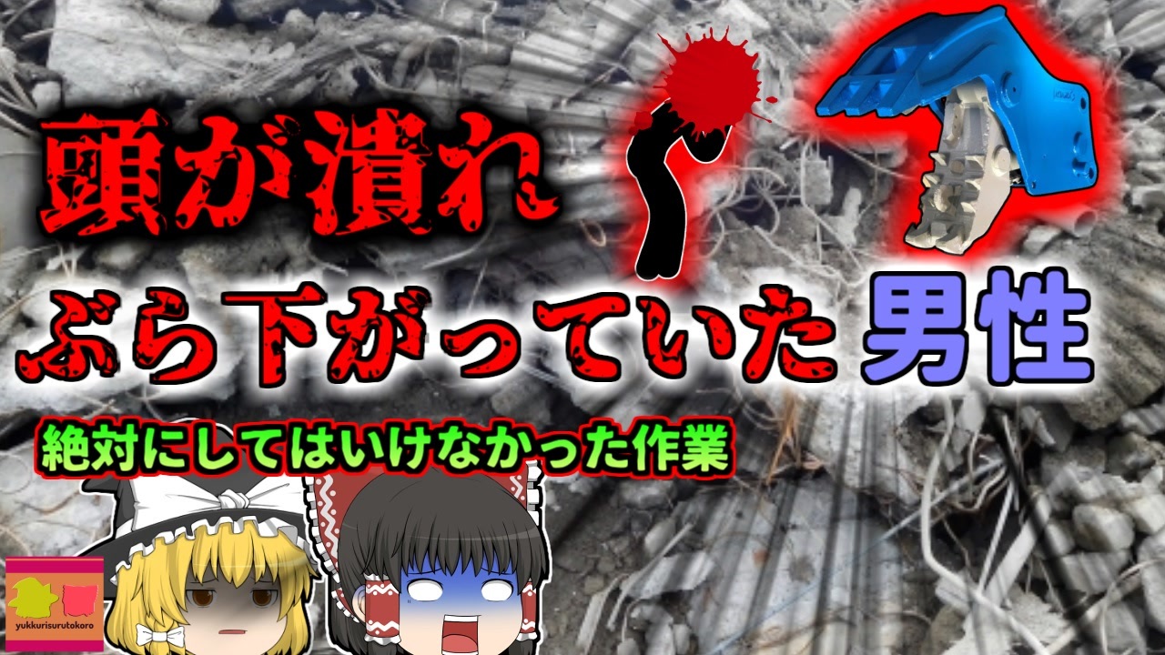 <a href="#" class="seekTime" data-seekTime="00:00" onclick="seekNicoPlayer('#00:00'); return false;">#00:00</a> 冒頭挨拶<br><a href="#" class="seekTime" data-seekTime="00:19" onclick="seekNicoPlayer('#00:19'); return false;">#00:19</a> 建設業<br><a href="#" class="seekTime" data-seekTime="00:56" onclick="seekNicoPlayer('#00:56'); return false;">#00:56</a> 視聴上の注意<br><a href="#" class="seekTime" data-seekTime="1:22" onclick="seekNicoPlayer('#1:22'); return false;">#1:22</a> 一軒家の解体工事<br><a href="#" class="seekTime" data-seekTime="1:42" onclick="seekNicoPlayer('#1:42'); return false;">#1:42</a> 作業員男性の「Aさん」<br><a href="#" class="seekTime" data-seekTime="2:14" onclick="seekNicoPlayer('#2:14'); return false;">#2:14</a> 解体作業の工程<br><a href="#" class="seekTime" data-seekTime="2:51" onclick="seekNicoPlayer('#2:51'); return false;">#2:51</a> フレコンバッグ<br><a href="#" class="seekTime" data-seekTime="3:10" onclick="seekNicoPlayer('#3:10'); return false;">#3:10</a> 小割圧砕機アタッチメント<br><a href="#" class="seekTime" data-seekTime="4:05" onclick="seekNicoPlayer('#4:05'); return false;">#4:05</a> 二人の荷吊り作業<br><a href="#" class="seekTime" data-seekTime="6:06" onclick="seekNicoPlayer('#6:06'); return false;">#6:06</a> いくつもの要因<br><a href="#" class="seekTime" data-seekTime="8:21" onclick="seekNicoPlayer('#8:21'); return false;">#8:21</a> 必要だった対策<br><br><br><br><br>今回紹介するのは、以前リクエストがありました、建設業での事例の一つです。<br>わが国の北関東、某市の住宅街の一角ではこの日、一軒家の解体作業が行われていました。<br>工事は市内の下請け解体業者に依頼され、作業員男性の「Aさん」は、現場で重機を操る作業を担当していました。<br>彼はこの日、コンクリートを粉砕するための、先端がくちばしのような形をした解体用重機を使い、家屋の資材を解体していきました。<br>解体には大量のコンクリート片や木片といった「がら」が出るため、それらはフレキシブルコンテナバッグという、専用の袋に入れて、トラックで別業者へと搬送されることになっていました。<br>Aさんは、同僚の作業員男性「Bさん」と打ち合わせを行い、彼と協力して、この重機の先端にバッグの帯をくくり、クレーンの代わりとして、トラックの荷台に移動させる作業を行いました。<br>Bさんの合図で、重機先端の顎を閉じ、アームを持ち上げたAさんでしたが、アームの向こう側、先端奥に見えていた、Bさんの身体が不自然に持ち上がるのが見え…<br><br>引用・出展・参考文献<br>小割圧砕機 - 日本ニューマチック工業<br><a href="https://ishort.ink/5mMi" target="_blank" rel="noopener nofollow">https://ishort.ink/5mMi</a><br>有限会社エイキ フレコンバッグと解体工事 - 富山市<br><a href="https://ishort.ink/o3T9" target="_blank" rel="noopener nofollow">https://ishort.ink/o3T9</a><br>NPK 日本ニューマチック工業㈱ 小割圧砕機<br><a href="https://ishort.ink/5mMi" target="_blank" rel="noopener nofollow">https://ishort.ink/5mMi</a><br>KOMATSU㈱車両系建設機械(解体用)運転技能講習<br><a href="https://ishort.ink/EFpp" target="_blank" rel="noopener nofollow">https://ishort.ink/EFpp</a><br><br><br><br />※この動画は過去の事件を知り、現在でも同じことが発生する危険性を再認識、関与しないように促すための動画であり、視聴者を扇動、動揺を誘うためのコンテンツではありません。<br><br>ご要望にお応えして、メンバーシップの開設を行いました。<br>下記URLからも登録可能ですので、ご興味がある方は是非ご参加ください。<br><a href="https://www.youtube.com/channel/UCcT5a1J7XJW7CLYI2RKl4pw/join" target="_blank" rel="noopener nofollow">https://www.youtube.com/channel/UCcT5a1J7XJW7CLYI2RKl4pw/join</a><br><br><br>Twitter<br>→<a href="https://twitter.com/yukkurisurutoko" target="_blank" rel="noopener nofollow">https://twitter.com/yukkurisurutoko</a><br><br>取り急ぎ、簡易的にですがマイリストを作りました。<br>【ゆっくり解説】事故・事件関係紹介リスト <br><a href="https://www.nicovideo.jp/mylist/71034319" target="_blank" rel="noopener nofollow">https://www.nicovideo.jp/mylist/71034319</a><br>【ゆっくり解説】放射線系事故<br><a href="https://www.nicovideo.jp/mylist/71034368" target="_blank" rel="noopener nofollow">https://www.nicovideo.jp/mylist/71034368</a><br>【ゆっくり解説】鉄道系事故・事件関連<br><a href="https://www.nicovideo.jp/mylist/71034379" target="_blank" rel="noopener nofollow">https://www.nicovideo.jp/mylist/71034379</a>