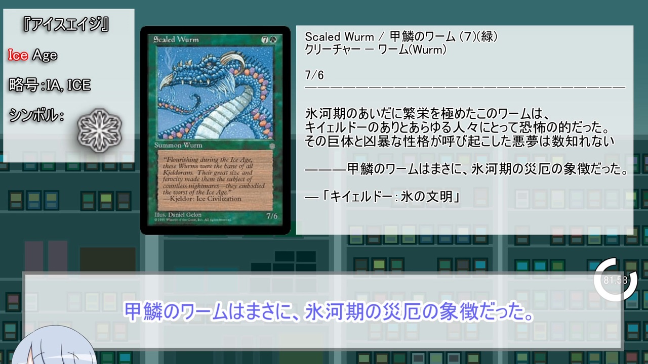 MTG動画作ってて、この日に動画をあげられることが本当にうれしい<br>長くなるので前編です<br><br>モダン一本<br>初心者エルドラージvs初心者緑白<br><br>つくよみちゃんはどんなデッキにでもあのカードを4枚入れたがる癖があります<br><br><span style="color: #ff0000;">※これは何話目の話なの? というかDMって宇宙シイタケ単体で勝てるゲームなのか?(ヒーロー脳</span><br>└第40話「キャップにキョーレツ刺激ング! ファイナルタワー頂上決戦!」みたいです<br><br><span style="color: #ff00ff; font-size: 16px;">※能力は色を持たない(405.4.)ので正確に言うと有色の発生源(から)の能力かな</span><br>└補足ありがとうございます!<br><br>405. スタック<br>405.4. 呪文は、そのカードが持つ特性全てを持つ。<span style="color: #ff00ff;"><u>スタックにある起動型能力や誘発型能力は、その能力のテキストだけを持ち、他の特性は持たない。</u></span>呪文のコントローラーは、それを唱えたプレイヤーである。起動型能力のコントローラーは、それを起動したプレイヤーである。遅延誘発型能力以外の誘発型能力のコントローラーは、その能力が誘発したときにその発生源をコントロールしていたプレイヤーである。遅延誘発型能力のコントローラーについては、rule 603.7d-f 参照。<br><br>702.16b プロテクションを持つパーマネントやプレイヤーは、<span style="color: #ff00ff;"><u>記述された性質を持つ呪文の対象 にならず、記述された性質を持つ能力の発生源からの能力の対象にもならない。</u></span><br><br><br><a href="https://www.nicovideo.jp/watch/sm42355093" class="watch">sm42355093</a><前 次><a href="https://www.nicovideo.jp/watch/sm42494860" class="watch">sm42494860</a><br>シリーズ><a href="https://www.nicovideo.jp/series/312890" target="_blank" rel="noopener">series/312890</a><br><br>さらに分かりやすくをモットーに新シリーズ<br>ギャラ子と一緒にアンタップ!<br><a href="https://www.nicovideo.jp/series/371671" target="_blank" rel="noopener">series/371671</a><br><br>VOICEVOX:春日部つむぎ<br>COEIROINK:つくよみちゃん<br><br>Discord鯖作りました、何かあればどうぞ<br><a href="https://discord.gg/bFzTQDSNpG" target="_blank" rel="noopener nofollow">https://discord.gg/bFzTQDSNpG</a><br><br>RULES- ルール文書 -<br><a href="https://mtg-jp.com/gameplay/rules/docs/0006836/" target="_blank" rel="noopener nofollow">https://mtg-jp.com/gameplay/rules/docs/0006836/</a>