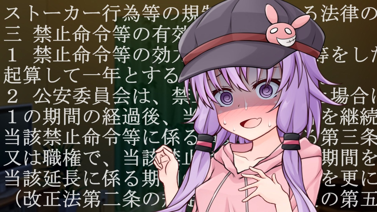 <span style="color: #9900ff;"><strong>ゆかりお姉さん「いいねしてね♡」</strong></span><br><br>前回(<a href="https://www.nicovideo.jp/watch/sm42394540" class="watch">sm42394540</a>)がちょっとだけハードだったので今回はソフトな内容になりました。<br><br>ストーカー規制法の詳細はこちら(参議院法制局のページ)<br><a href="https://houseikyoku.sangiin.go.jp/bill/outline28102.htm" target="_blank" rel="noopener nofollow">https://houseikyoku.sangiin.go.jp/bill/outline28102.htm</a><br>01:17ぐらいの注釈については上記ページ内リンクの"<span style="color: #ff9900;">●</span>概要【PDF:185KB】"を参照。<br><br>このシリーズ→<a href="https://www.nicovideo.jp/series/448594" target="_blank" rel="noopener">series/448594</a><br>㋳ンデレシリーズ→<a href="https://www.nicovideo.jp/series/175195" target="_blank" rel="noopener">series/175195</a><br>各シリーズPart1まとめ→<a href="https://www.nicovideo.jp/mylist/65930457" target="_blank" rel="noopener">mylist/65930457</a><br>投稿者のTwitter(連絡先)→<a href="https://twitter.com/shihabuki" target="_blank" rel="noopener nofollow">https://twitter.com/shihabuki</a><br><br>YouTube版(エコノミー回避用)→<a href="https://www.youtube.com/playlist?list=PLth9cfLQrdQWwEK1DH4cShhOvBfQwKS1O" target="_blank" rel="noopener nofollow">https://www.youtube.com/playlist?list=PLth9cfLQrdQWwEK1DH4cShhOvBfQwKS1O</a><br><br>お借りした素材<br>立ち絵:ああつ様/他素材:童謡・唱歌の世界様、Classical Music Sound Library様、OtoLogic様、On-Jin ~音人~様、無料効果音で遊ぼう!様、きまぐれアフター様、silhouette AC様、イラストマンション様、きままに様、woystr様、フリー素材あそび様、ふい字置き場様、8:51:22 pm の云々様。