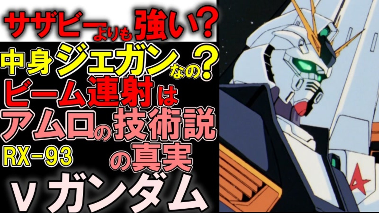 逆襲のシャアに登場するMS、RX-93νガンダムの強さと欠点、サザビーとの比較を交え、最後にビームライフルアムロの技術説について解説、考察する動画です。<br><br>今回は解説と考察が同じくらいです。<br><br>最後の部分の修正迷いましたが今日から頭の片隅に住み着いたνガンダムくんが、俺もやったんだからもう行きなよと言うのでアップロードです。<br>なのでたぶんこれがビームライフルアムロの技術説の真実で答えなんだと思います。<br><br>1:アムロにしかあの撃ち方は出来ない。<br>2:アムロにしかあの撃ち方は出来ない。<br><br>上と下は全く同じ言葉ですが、実は真逆の意味だったり。<br>言葉って難しいですね。<br>恐らく聞き間違えた結果こうなったのだと思いますが、御本人に確認を取ったわけでは無いのでこの動画での私の結論は間違えてる可能性もあります。<br><br>質問、などありましたらこちらにも<br><a href="https://twitter.com/@i4S0LHspdgzBTor" target="_blank" rel="noopener nofollow">https://twitter.com/@i4S0LHspdgzBTor</a><br><br>清見元康名義でたいあっぷ、小説家になろう、カクヨムなどに投稿しています。<br>もし良ければ応援お願いしますm(_ _)m<br><a href="https://tieupnovels.com/user/GariGari" target="_blank" rel="noopener nofollow">https://tieupnovels.com/user/GariGari</a><br><a href="https://mypage.syosetu.com/953815/" target="_blank" rel="noopener nofollow">https://mypage.syosetu.com/953815/</a><br><a href="https://kakuyomu.jp/users/GariD/works" target="_blank" rel="noopener nofollow">https://kakuyomu.jp/users/GariD/works</a><br><br>現在の最新作(短編コメディ):<br>何度繰り返してもギロチン送りにされる悪役令嬢は閃いた『敵対する者全員可愛いアイドルにしてしまおう!』アイドルギルドマスターに私はなる!<br><a href="https://ncode.syosetu.com/n2478hi/" target="_blank" rel="noopener nofollow">https://ncode.syosetu.com/n2478hi/</a><br><br>以前の作品(短編シリアス):<br>転生した厄災の大魔女はやがて聖女と呼ばれる<br><a href="https://ncode.syosetu.com/n0827ha/" target="_blank" rel="noopener nofollow">https://ncode.syosetu.com/n0827ha/</a><br><br>A.I.VOICE:結月ゆかり<br>VOICEVOX:ずんだもん<br>VOICEVOX:四国めたん<br><br>使用させていただいたずんだもん:<br>ずんだもん mini Deluxe(立ち絵) ver1.2<br><a href="https://seiga.nicovideo.jp/seiga/im10794509" target="_blank" rel="noopener nofollow">https://seiga.nicovideo.jp/seiga/im10794509</a><br><br>富野監督役として使用させていただいた四国めたん:<br><a href="https://seiga.nicovideo.jp/seiga/im10890883" target="_blank" rel="noopener nofollow">https://seiga.nicovideo.jp/seiga/im10890883</a><br><br><br>いつも広告、コメントありがとうございます。<br>励みになりますm(_ _)m<br>
