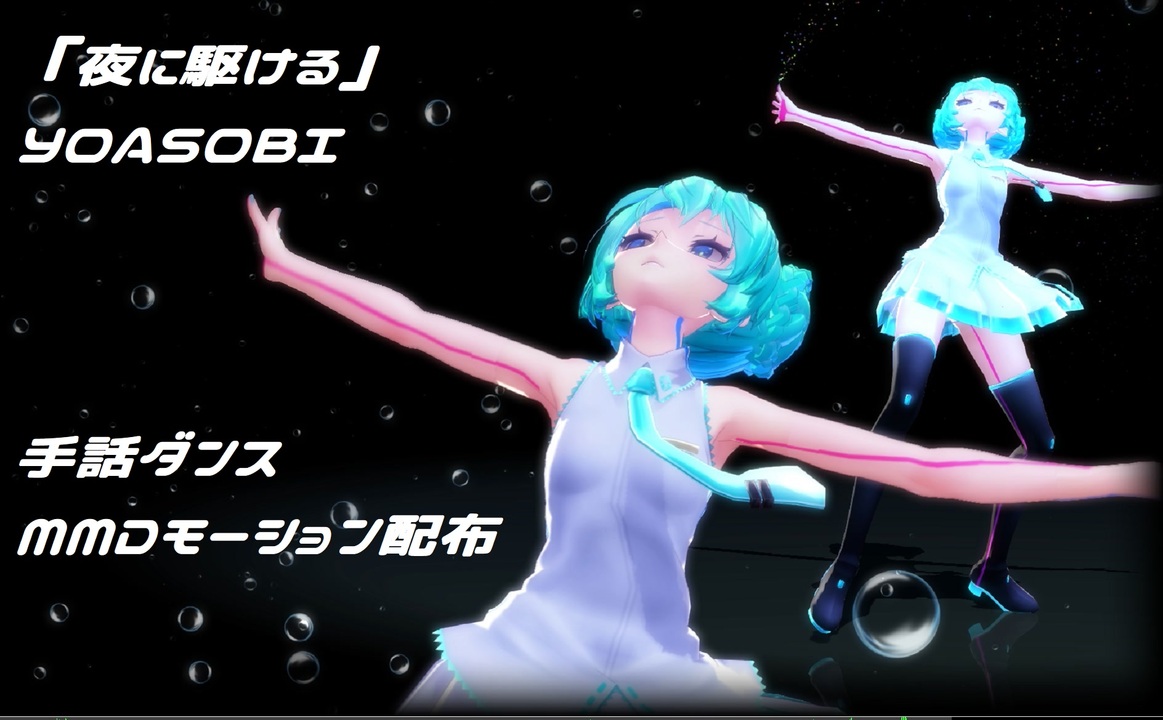高画質版:<a href="https://youtu.be/H_taFoH5TxE" target="_blank" rel="noopener nofollow">https://youtu.be/H_taFoH5TxE</a><br>トレース完成しましたので 配布いたします。<br>使いどころは難しいかもしれませんが、PV動画の途中に差し込むとかでもよいと思います。<br><br>今回初めて トレースせずに足IKを全打ちしてみました。<br>全編業務的で楽しくはないトレースとは違って 脳内フル回転で楽しかったですよ!<br><br>(参考までに 最終的に取った手法)<br>1センターグルーブを打って<br> <strong>大まかな「重心位置」を先に確定(★)</strong><br>2その重心を支える「足さばき」を足IK「すり足」で作成<br>3持ち上げ位置を追加(3点うち)・・<br>4リズムに合わせて音を聞きながら 1動作をまとめて 1f単位で接地タイミングを調整<br>5持ち上げと設置をつま先設置2点加えて 5点打ちとする<br>6足ボーンと下半身で内・外股を設定<br>7再度重心をセンターにて調整<br><br>脳内にどれだけ多くの「足さばきのビジュアル」を持っているかが肝だと思います!<br><br>通常のトレースとはトレース順が異なります<br> 通常:足IKが先に確定し、<strong><u>支えられる重心位置をセンターで確定</u></strong><br> 今回:センター位置を確定(★)して <strong><u>重心を支える位置に足IKを合わせる</u></strong><br>ご不明な点はお問い合わせください。<br><br>参考作成時間:モーション(64時間) リップ表情(3時間)<br><br>トレース元:<br>【手話】夜に駆ける YOASOBI 耳の聞こえないアーティスト<br><a href="https://www.youtube.com/watch?v=cS0MHkzEmuU" target="_blank" rel="noopener nofollow">https://www.youtube.com/watch?v=cS0MHkzEmuU</a><br><br>音源:<br><a href="https://commons.nicovideo.jp/tree/sm37014977" target="_blank" rel="noopener nofollow">https://commons.nicovideo.jp/tree/sm37014977</a><br><br><br />共通コメント<br>★ご不明な点は、動画内にコメントにどうぞ~。後で回答いたします^^★<br>基本的な配布は下記に移行中です。<br><a href="https://touzoku-tsubaki.booth.pm/" target="_blank" rel="noopener nofollow">https://touzoku-tsubaki.booth.pm/</a><br>・無造作にDLされない為の抑止の為の措置です。ご理解ください。<br>・モーションはMMDモデル用に作っているものです。<br> その他のモデルで、表情や、準標準ボーンが欠落された状態でご使用になる場合は<br> 「テスト」と説明文に入れてください!<br>・カメラ制作や共同制作などされる方はお申し出ください(個別対応いたします)<br><a href="https://x.com/touzoku_tsubaki" target="_blank" rel="noopener nofollow">https://x.com/touzoku_tsubaki</a><br><br><span style="font-size: 13px;">リップは LipFaceMakerにて作成しております(一部使用していない動画もございます)<br>LipFaceMaker配布先は(</span><a href="https://www.nicovideo.jp/watch/sm28872338" class="watch">sm28872338</a><span style="font-size: 13px;">)でご案内しています </span><br><br><span style="font-size: 13px;">トレース覚書ブログ </span><a href="http://blog.livedoor.jp/touzokutsubaki/archives/9744704.html" target="_blank" rel="noopener nofollow">http://blog.livedoor.jp/touzokutsubaki/archives/9744704.html</a><br>ギターの持たせ方 <a href="http://blog.livedoor.jp/touzokutsubaki/archives/9744681.html" target="_blank" rel="noopener nofollow">http://blog.livedoor.jp/touzokutsubaki/archives/9744681.html</a><br>表情講座:<a href="https://www.nicovideo.jp/watch/sm43683305" target="_blank" rel="noopener nofollow">https://www.nicovideo.jp/watch/sm43683305</a><br>カメラ講座:<a href="https://www.nicovideo.jp/watch/sm43547510" target="_blank" rel="noopener nofollow">https://www.nicovideo.jp/watch/sm43547510</a><br><br><br><span style="font-size: 13px;">生トレースすること多いので お気軽にお声がけください^^</span><br><a href="https://www.nicovideo.jp/mylist/21358258" target="_blank" rel="noopener">mylist/21358258</a>(盗賊つばき)<br><span style="font-size: 14px;">mylist/</span>69214910<span style="font-size: 14px;">(盗賊つばき)</span><br><a href="https://www.nicovideo.jp/mylist/51346572" target="_blank" rel="noopener">mylist/51346572</a>(だんしゃくいも)