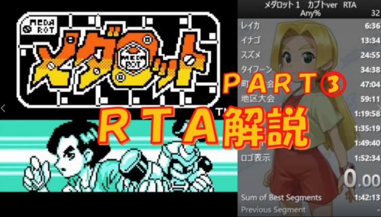 計測区間:ゲーム開始「はじめから」を選択~スタッフロール終了後のイマジニアロゴ表示<br><br>今回は地区大会~本大会後のタイヨー戦までの解説になります。<br>所々に誤字、脱字、計算ミスがあるかもしれません。m(__)m<br><br>追記(2023.7.12)<br>たくさんの広告、いいね、コメントありがとうございます!<br>17:10~ カリブ、シベリア、ポリネシアは国ではありませんでした。<br>お詫びして訂正いたします。(/ω\)<br><br>追記(2023.8.30)<br>1:05~ <s>マゼンダキャット</s> → マゼンタキャット<br>1:30~ <s>サンドバック</s> → サンドバッグ<br>でした。お詫びして訂正いたします。( TДT)<br><br><動画制作の参考文献><br>メダロット スポイラー様 <a href="https://mysite-dceb6.firebaseapp.com/meda/index.html" target="_blank" rel="noopener nofollow">https://mysite-dceb6.firebaseapp.com/meda/index.html</a><br>メダロット辞典@wiki様 <a href="http://w.atwiki.jp/medadictionary/pages/1.html" target="_blank" rel="noopener nofollow">http://w.atwiki.jp/medadictionary/pages/1.html</a><br>メダロット初代(カブトver)Any%RTA 1:53:25の覚え書き(べべーん様)<br><a href="https://note.com/bebe_n/n/n1451f430fefd" target="_blank" rel="noopener nofollow">https://note.com/bebe_n/n/n1451f430fefd</a><br><br><a href="https://www.nicovideo.jp/mylist/75251633" target="_blank" rel="noopener">mylist/75251633</a><br><br>part①→(<a href="https://www.nicovideo.jp/watch/sm42159001" class="watch">sm42159001</a>)<br>part②→(<a href="https://www.nicovideo.jp/watch/sm42282422" class="watch">sm42282422</a>)<br>part③(この動画)<br>part④→(<a href="https://www.nicovideo.jp/watch/sm43032440" class="watch">sm43032440</a>)