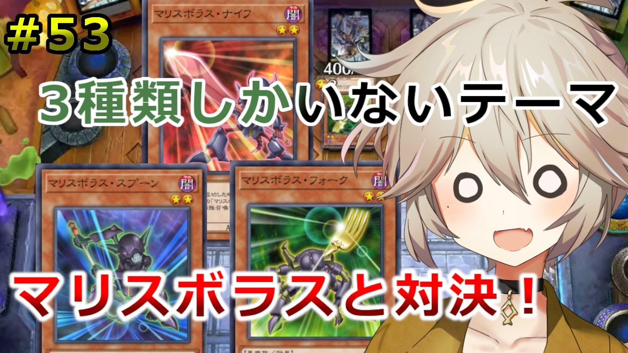 完全に初めて聞くテーマでした。<br><br>【企画の基本ルール】<br>・初期デッキを使用して決闘する<br>・1勝する度マスターパックを1パック開封する<br>・引いたカードだけでデッキを強化する<br><br>【企画の詳細ルール】<br><a href="https://docs.google.com/spreadsheets/d/e/2PACX-1vQCpEJwbgASrbv_7bTUk-4_EnpDFl3gBi0oyJm1iQ6Kfw3xPVeRZcNpcZOTzTi0E3W4-npaE4uGUEO_/pubhtml" target="_blank" rel="noopener nofollow">https://docs.google.com/spreadsheets/d/e/2PACX-1vQCpEJwbgASrbv_7bTUk-4_EnpDFl3gBi0oyJm1iQ6Kfw3xPVeRZcNpcZOTzTi0E3W4-npaE4uGUEO_/pubhtml</a><br>--------------------------<br>【現在の獲得カード一覧】(最新part時点のものです。ネタバレ注意!)<br><a href="https://docs.google.com/spreadsheets/d/e/2PACX-1vQ3reKabJXHbacrwTqmZAplhKKPS6PbF8rOvZwgXbuu5ztX3hoXc1pFk8aRo24UjZ4REO7Rkc7GF7bY/pubhtml" target="_blank" rel="noopener nofollow">https://docs.google.com/spreadsheets/d/e/2PACX-1vQ3reKabJXHbacrwTqmZAplhKKPS6PbF8rOvZwgXbuu5ztX3hoXc1pFk8aRo24UjZ4REO7Rkc7GF7bY/pubhtml</a><br><br>【今回使用したデッキ】(最新part時点のものです。ネタバレ注意!)<br><a href="https://www.db.yugioh-card.com/yugiohdb/member_deck.action?ope=1&cgid=53230c63f846279a61029b932c019279&dno=26" target="_blank" rel="noopener nofollow">https://www.db.yugioh-card.com/yugiohdb/member_deck.action?ope=1&cgid=53230c63f846279a61029b932c019279&dno=26</a><br>---------------------------<br><br>【使用音声】<br>・VOICEVOX-春日部つむぎ<br>・VOICEVOX-冥鳴ひまり<br>・VOICEVOX-WhiteCUL<br><a href="https://voicevox.hiroshiba.jp/" target="_blank" rel="noopener nofollow">https://voicevox.hiroshiba.jp/</a><br><br>【使用画像】<br>・春日部つむぎ公式立ち絵素材<br><a href="https://booth.pm/ja/items/3474402" target="_blank" rel="noopener nofollow">https://booth.pm/ja/items/3474402</a><br>・いらすとや<br><a href="https://www.irasutoya.com/" target="_blank" rel="noopener nofollow">https://www.irasutoya.com/</a><br><br>【使用BGM】<br>・「Excuse」zukisuzuki様<br>・「戦いの旅路を征く」MATSU 様<br>・「Winning Road」まんぼう二等兵様<br><br>【Twitter】<br><a href="https://twitter.com/seven_Tsumugi" target="_blank" rel="noopener nofollow">https://twitter.com/seven_Tsumugi</a><br><br>【マイリスト】<br><a href="https://www.nicovideo.jp/mylist/74284514" target="_blank" rel="noopener nofollow">https://www.nicovideo.jp/mylist/74284514</a><br><br>【youtube】<br><a href="https://youtu.be/VugeX1gaXaw" target="_blank" rel="noopener nofollow">https://youtu.be/VugeX1gaXaw</a><br>