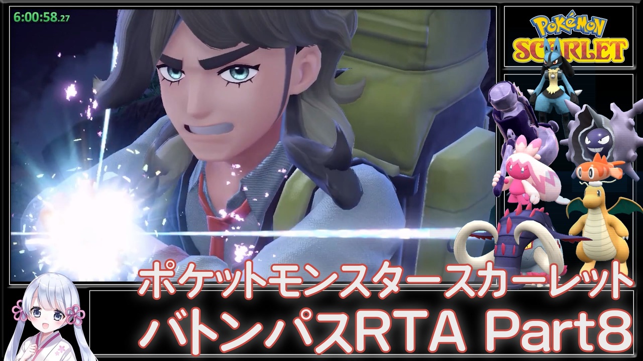連戦に次ぐ連戦なので初投稿です。<br><br>■カテゴリー|Any% Glitchless ENG (Baton Pass)<br>・Speedrun.comの英語版ルールに準拠<br>・バグ技禁止で最後までクリアする<br>・計測区間|最初の移動入力~最終入力後の暗転まで<br>・ver1.3.1(プレイ時点での最新版)<br><br>■バトンパスルール<br>・ストーリー上の主要バトルにおいて、使用するポケモンを毎回変えなければならない<br>・進化系統が同じポケモンも、まとめて使用不可対象となる<br>NGな例<br>・「1番目のジムにホゲータを使用し、2番目のジムでアチゲータを使う」<br><br>SVでは先駆者がいなかったので、下記を主要バトルとしました<br>◎チャンピオンロード / Victory Road<br>・ジムリーダー<br>・ポケモンリーグ(四天王+オモダカ)<br>・ネモ最終戦<br>◎レジェンドルート / Path of Legends<br>・全5箇所のヌシ<br>・ペパー2戦目<br>◎スターダスト★ストリート / ★ Starfall Street ★<br>・全5箇所のボス<br>・クラベル戦<br>・ボタン戦<br><br>その他の一般トレーナー・野生戦は縛り対象外<br>2023/06/13 オフラインで達成<br><br>ルート(スプレッドシート)|<a href="https://docs.google.com/spreadsheets/d/1Reqv1VJTe832JqtzPTSsfPP1cE1r3jvH0QgUNduHv80/edit?usp=sharing" target="_blank" rel="noopener nofollow">https://docs.google.com/spreadsheets/d/1Reqv1VJTe832JqtzPTSsfPP1cE1r3jvH0QgUNduHv80/edit?usp=sharing</a><br>Youtube版(全編一括)|<a href="https://youtu.be/Qo8IqIzNe9k" target="_blank" rel="noopener nofollow">https://youtu.be/Qo8IqIzNe9k</a><br><br>Twitter|<a href="https://twitter.com/mizuki_aihr" target="_blank" rel="noopener nofollow">https://twitter.com/mizuki_aihr</a><br>Youtube|<a href="https://www.youtube.com/@mizukiaiharagaming5018" target="_blank" rel="noopener nofollow">https://www.youtube.com/@mizukiaiharagaming5018</a><br>Twitch|<a href="https://www.twitch.tv/mizukiaihara" target="_blank" rel="noopener nofollow">https://www.twitch.tv/mizukiaihara</a><br><br>前|<a href="https://www.nicovideo.jp/watch/sm42473724" class="watch">sm42473724</a><br>次|<a href="https://www.nicovideo.jp/watch/sm42473746" class="watch">sm42473746</a> <strong>7/15 17時公開</strong><br><br>解説|つくよみちゃん (フリー読み上げソフト COEIROINK を使用)<br>立ち絵|えみゃコーラ様<br>フリー素材キャラクターつくよみちゃん|<a href="https://tyc.rei-yumesaki.net/" target="_blank" rel="noopener nofollow">https://tyc.rei-yumesaki.net/</a>