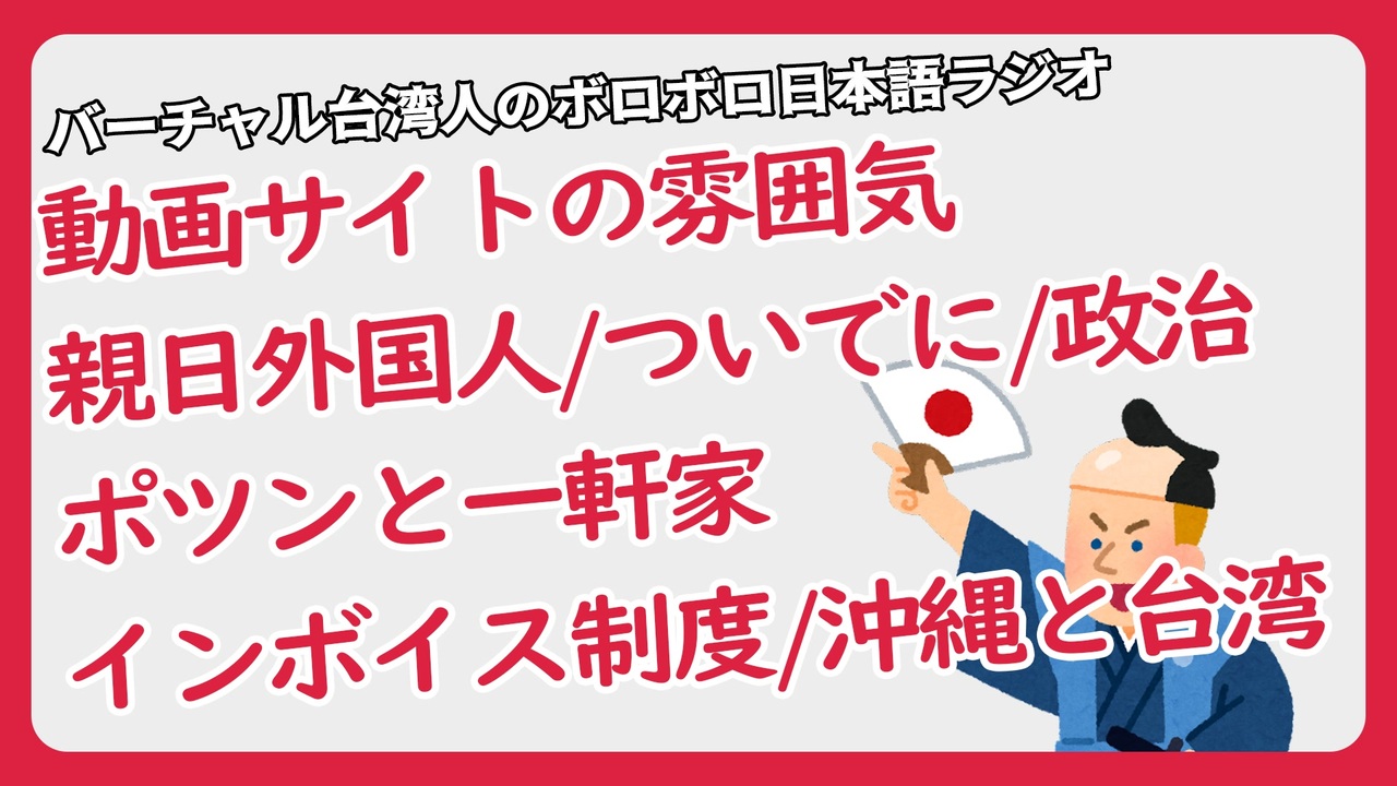 2023年07月12日配信の切り抜きです。<br><br>00:00 ニコニコ動画とYouTubeの雰囲気<br>07:00 親日外国人YouTuber<br>11:54 ついでに<br>16:39 政治の話題<br>18:40 ポツンと一軒家<br>20:05 インボイス制度<br>24:51 沖縄事情を見る視点は台湾事情を見るに近い<br>30:00 日本の選挙は盛り上がれない<br><br>●動画リンク:<br>Youtube→<a href="https://www.youtube.com/watch?v=tz1zTNohp2k" target="_blank" rel="noopener nofollow">https://www.youtube.com/watch?v=tz1zTNohp2k</a><br>Youtube録画→<a href="https://www.youtube.com/watch?v=qi8dn8HwfQw" target="_blank" rel="noopener nofollow">https://www.youtube.com/watch?v=qi8dn8HwfQw</a><br>Niconico→<a href="https://www.nicovideo.jp/watch/sm42477398" target="_blank" rel="noopener nofollow">https://www.nicovideo.jp/watch/sm42477398</a><br>Nico生録画→<a href="https://live.nicovideo.jp/watch/lv342081445" target="_blank" rel="noopener nofollow">https://live.nicovideo.jp/watch/lv342081445</a><br>(サムネ画像:いらすとや)
