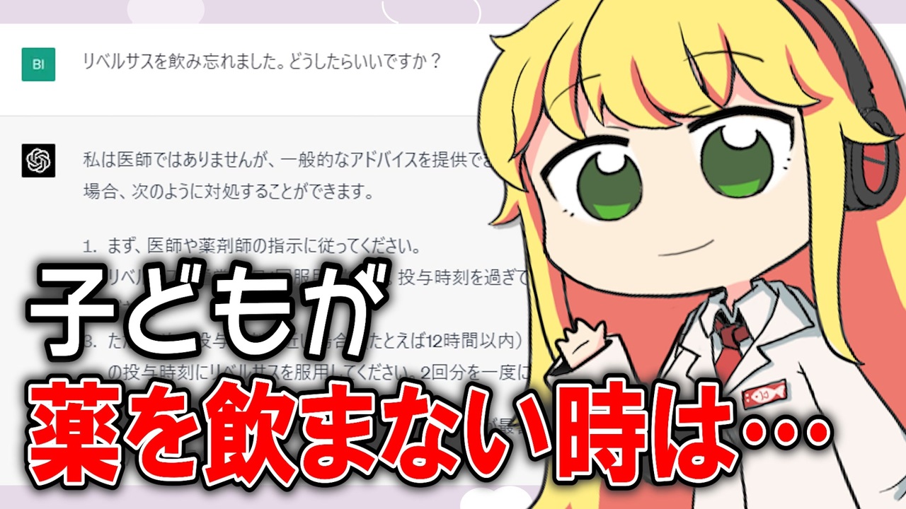 セイカフェスの動画はこの動画の後に作りました。<br><br>話題のテキスト生成AI、ChatGPTにお薬の解説をさせたらどうなるんだろと思ってやってみました。<br><br>動画では原則、GPT-4を取り扱っています。GPT3.5を使うときはそう記載します。<br><br><span style="color: #ff0000; font-size: 16px;"><strong>いいねをするとプチお薬解説が見れるよ!</strong></span><br><br>Youtube(ゲーム実況チャンネル)<br><a href="https://www.youtube.com/channel/UCcLWyYVS3ysazvYjN7pKXuw" target="_blank" rel="noopener nofollow">https://www.youtube.com/channel/UCcLWyYVS3ysazvYjN7pKXuw</a><br>Youtube(お薬解説チャンネル)2023年1月1日運用開始<br><a href="https://www.youtube.com/channel/UCqp3XrY7wux-E3kl4A4ZmQQ" target="_blank" rel="noopener nofollow">https://www.youtube.com/channel/UCqp3XrY7wux-E3kl4A4ZmQQ</a><br>Twitter<br><a href="https://twitter.com/Iwashi_bibili" target="_blank" rel="noopener nofollow">https://twitter.com/Iwashi_bibili</a> <br><br><br>立ち絵:<br>弦巻マキ:えびごはん 様( <a href="https://twitter.com/ebi_gohan )" target="_blank" rel="noopener nofollow">https://twitter.com/ebi_gohan )</a> <br><<オリジナル立ち絵のため配布しておりません>><br>紲星あかり:ふにちか 様(<a href="https://seiga.nicovideo.jp/seiga/im9588561" target="_blank" rel="noopener">im9588561</a>)<br><br>使用ソフト:<br>Premiere pro<br>AfterEffects<br>2dActorTools<br>PSDTool<br>VOICEROID2<br>VoiceroidUtil<br>