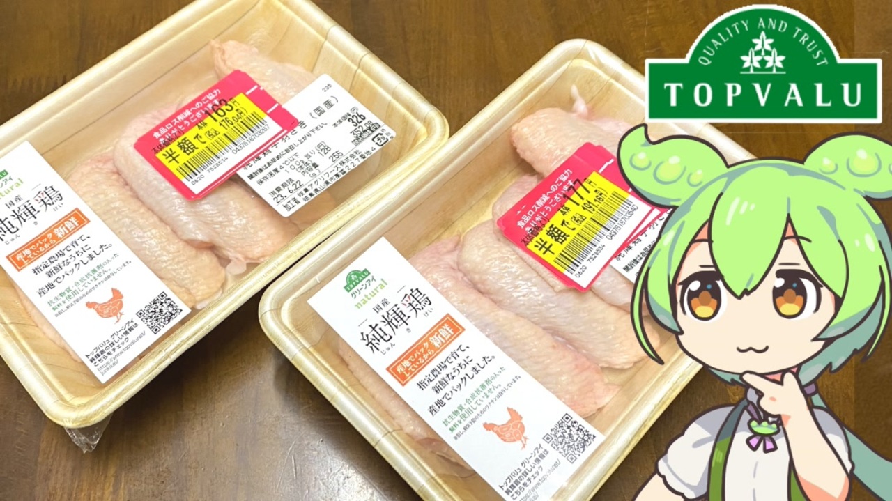 純輝鶏(ジュンキケイ)はイオンのブランド鶏だそうです。<br><br><br>【参考】<br>純輝鶏とは(トップバリュ)<br><a href="https://www.topvalu.net/junkikei/" target="_blank" rel="noopener nofollow">https://www.topvalu.net/junkikei/</a><br>焼酎ハイボールレモン 辛口)(トップバリュ)<br><a href="https://www.topvalu.net/items/detail/4549741871747/" target="_blank" rel="noopener nofollow">https://www.topvalu.net/items/detail/4549741871747/</a><br>たっぷり使えるごま香る油豊かなごまの風味(トップバリュ)<br><a href="https://www.topvalu.net/items/detail/4549741528641/" target="_blank" rel="noopener nofollow">https://www.topvalu.net/items/detail/4549741528641/</a><br>ガス火専用 サッと手軽に料理できる軽量フライパン 26cm(トップバリュ)<br><a href="https://www.topvalu.net/items/detail/4549414282542/" target="_blank" rel="noopener nofollow">https://www.topvalu.net/items/detail/4549414282542/</a><br>ニチレイの手羽先レシピ<br><a href="https://www.nichireifoods.co.jp/media/29105/" target="_blank" rel="noopener nofollow">https://www.nichireifoods.co.jp/media/29105/</a><br>動物に使用する抗菌性物質について(農林水産省)<br><a href="https://www.maff.go.jp/j/syouan/tikusui/yakuzi/torikumi.html" target="_blank" rel="noopener nofollow">https://www.maff.go.jp/j/syouan/tikusui/yakuzi/torikumi.html</a><br>抗菌性物質とはなんですか?(農林水産省)<br><a href="https://www.maff.go.jp/j/syouan/tikusui/yakuzi/antimicrobials.html" target="_blank" rel="noopener nofollow">https://www.maff.go.jp/j/syouan/tikusui/yakuzi/antimicrobials.html</a><br><br><br>【使用した素材】(※敬称略)<br>(合成音声)VOICEVOX/ずんだもん/四国めたん<br><a href="https://voicevox.hiroshiba.jp/" target="_blank" rel="noopener nofollow">https://voicevox.hiroshiba.jp/</a><br>(立ち絵)坂本アヒル<br><a href="https://seiga.nicovideo.jp/seiga/im10788496" target="_blank" rel="noopener">im10788496</a>/<a href="https://seiga.nicovideo.jp/seiga/im10791276" target="_blank" rel="noopener">im10791276</a><br>(楽曲)甘茶の音楽工房/「楽しい麦畑」「フルーツパフェ」「お城の舞踏会」<br><a href="https://amachamusic.chagasi.com/" target="_blank" rel="noopener nofollow">https://amachamusic.chagasi.com/</a><br><br><br>【関連動画】<br>トップバリュの緑のヤツ「タスマニアビーフのステーキ」※イオンのブランド牛<br><a href="https://www.youtube.com/watch?v=9j0TlyvjQ5s&t=233s&ab_channel=maryu4492" target="_blank" rel="noopener nofollow">https://www.youtube.com/watch?v=9j0TlyvjQ5s&t=233s&ab_channel=maryu4492</a>