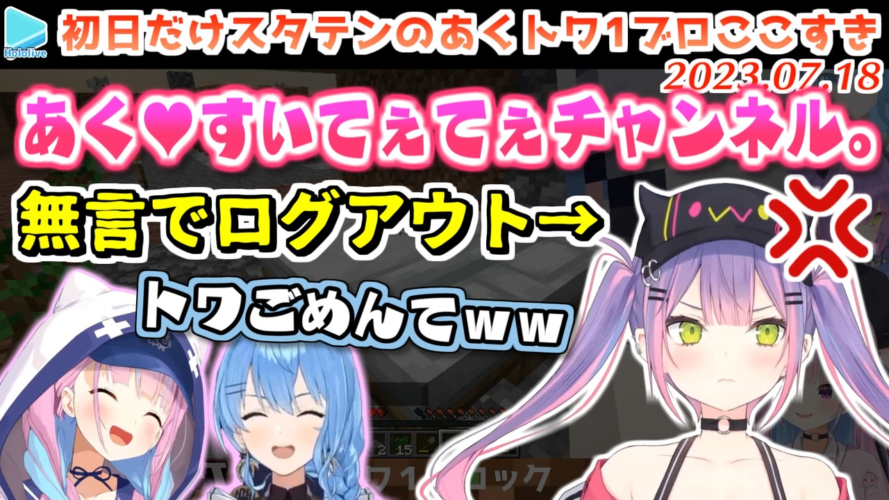 NOT不仲<br><br><a href="#" class="seekTime" data-seekTime="00:00" onclick="seekNicoPlayer('#00:00'); return false;">#00:00</a> ログイン、最初はやはり落としあい<br><a href="#" class="seekTime" data-seekTime="02:14" onclick="seekNicoPlayer('#02:14'); return false;">#02:14</a> 洗礼クリーパー<br><a href="#" class="seekTime" data-seekTime="05:18" onclick="seekNicoPlayer('#05:18'); return false;">#05:18</a> オオカミ襲来<br><a href="#" class="seekTime" data-seekTime="10:51" onclick="seekNicoPlayer('#10:51'); return false;">#10:51</a> すいせいVSオオカミ四天王<br><a href="#" class="seekTime" data-seekTime="11:52" onclick="seekNicoPlayer('#11:52'); return false;">#11:52</a> 萎え落ちトワ<br><a href="#" class="seekTime" data-seekTime="13:09" onclick="seekNicoPlayer('#13:09'); return false;">#13:09</a> あくトワ不仲<br><a href="#" class="seekTime" data-seekTime="13:44" onclick="seekNicoPlayer('#13:44'); return false;">#13:44</a> あくあとトワのオーディション裏話<br><a href="#" class="seekTime" data-seekTime="16:01" onclick="seekNicoPlayer('#16:01'); return false;">#16:01</a> ミオママとマリンママ<br><br>元動画様はこちら<br>【#あくトワ1ブロック】あくトワてぇてぇするまで出られない部屋withすいせい【湊あくあ/ホロライブ】<br><a href="https://youtu.be/0tAX8zKK6Qk" target="_blank" rel="noopener nofollow">https://youtu.be/0tAX8zKK6Qk</a><br><br>【#ぺこマリ1ブロック】1ブロックしかない世界で生き残る。ぺこ!【ホロライブ/兎田ぺこら】2021/11/18<br><a href="https://youtu.be/E53D9tfVi4E" target="_blank" rel="noopener nofollow">https://youtu.be/E53D9tfVi4E</a><br><br>【#1ブロSMOK】1ブロックからはじまる、SMOK生活【マイクラ】2023/02/12<br><a href="https://youtu.be/BcYDUUFbj7A" target="_blank" rel="noopener nofollow">https://youtu.be/BcYDUUFbj7A</a><br><br>【 #1ブロmiComet 】ビジネスの力で1ブロ生活!!!!!!!にぇ【ホロライブ/さくらみこ】2023/05/26<br><a href="https://youtu.be/CklNxvworF8" target="_blank" rel="noopener nofollow">https://youtu.be/CklNxvworF8</a><br><br>Aqua Ch. 湊あくあ <a href="https://t.co/JLElyrjgQe" target="_blank" rel="noopener nofollow">https://t.co/JLElyrjgQe</a><br>Suisei Channel <a href="https://t.co/VezQQPDAO0" target="_blank" rel="noopener nofollow">https://t.co/VezQQPDAO0</a><br>Towa Ch. 常闇トワ <a href="https://t.co/w6M3gpLfyP" target="_blank" rel="noopener nofollow">https://t.co/w6M3gpLfyP</a><br /><span style="color: #b7b7b7; font-size: 10px;">ホロライブ切り抜き/なめたけ <a href="https://t.co/CBwJLnYR2c" target="_blank" rel="noopener nofollow">https://t.co/CBwJLnYR2c</a></span>