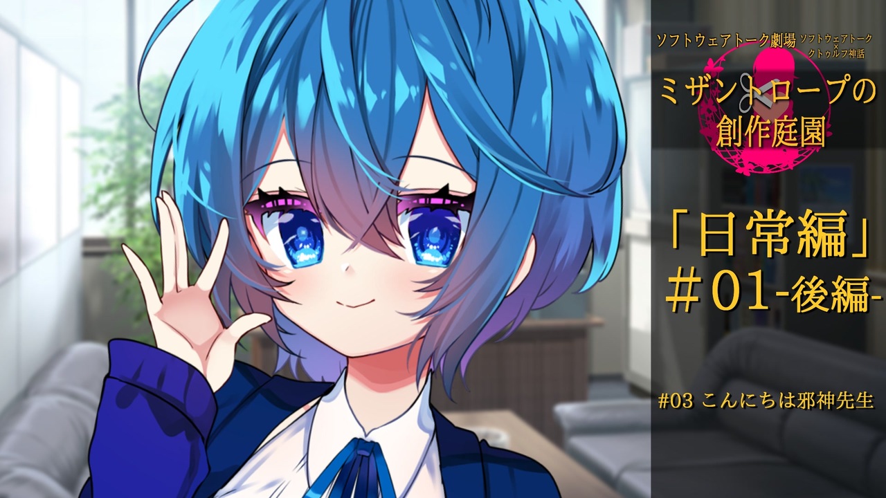 #03 こんにちは邪神先生<br><br><br>◆注意事項<br>・日常、ギャグ、シリアスが含まれる場合があります<br>・クトゥルフ神話(TRPGではないです)<br>・ソフトウェアトーク劇場<br>・グロテスク、残酷、猟奇的、暴力的な描写を含みます<br>・クトゥルフ神話、幽霊、妖怪などに対する独自解釈<br>・登場するソフトウェアトークのキャラクターの二次設定<br>・登場するキャラクターの血縁関係の二次設定<br>・オリキャラ<br><br>上記内容を留意した上で、<br>ご視聴していただくようお願いします。<br><br>◆使用合成音声ソフト<br>CeVIO AI 小春六花 トークボイス<br>VOICEROID+ 月読アイ EX<br>VOICEROID+ 月読ショウタ EX<br>VOICEROID+ 東北きりたん EX<br>VOICEVOX:春日部つむぎ<br>VOICEROID2 琴葉 茜・葵<br>VOICEROID2 ついなちゃん<br>ガイノイドTALK 鳴花ヒメ・ミコト<br>CeVIO AI すずきつづみ トークボイス<br>VOICEROID2 紲星あかり<br><br>◆使用BGM<br>海底に眠る響き/shimtone 様:DOVA-SYNDROME<br>2:23 AM/しゃろう様:<a href="https://commons.nicovideo.jp/works/nc231865" target="_blank" rel="noopener">nc231865</a><br>Cecilia/セシリア -remix-/田中芳典様:<a href="https://commons.nicovideo.jp/works/nc222961" target="_blank" rel="noopener">nc222961</a><br>Mellow Mellow /yuhei komatsu 様:<a href="https://commons.nicovideo.jp/works/nc283593" target="_blank" rel="noopener">nc283593</a><br><br>◆その他<br>背景素材 事務所_応接室:きまぐれアフター 様<br><br>◆他に投稿しているソフトウェアトーク動画シリーズについて<br>『○○な人』(完結済):<a href="https://www.nicovideo.jp/series/6946" target="_blank" rel="noopener">series/6946</a><br>ささやきに耳を傾けて(完結済):<a href="https://www.nicovideo.jp/series/124858" target="_blank" rel="noopener">series/124858</a><br>探索者『すずきつづみ』(完結済):<a href="https://www.nicovideo.jp/series/173614" target="_blank" rel="noopener">series/173614</a><br>単発ボイロ劇場:<a href="https://www.nicovideo.jp/series/209904" target="_blank" rel="noopener">series/209904</a><br>君と僕のGlory Days:<a href="https://www.nicovideo.jp/series/279742" target="_blank" rel="noopener">series/279742</a><br>ボイロTRPG:<a href="https://www.nicovideo.jp/series/210184" target="_blank" rel="noopener">series/210184</a>