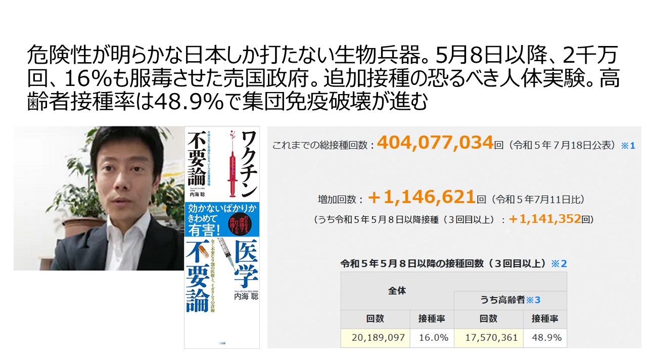 首相官邸での接種回数、接種率<br><a href="https://www.kantei.go.jp/jp/headline/kansensho/vaccine_note.html#note-3" target="_blank" rel="noopener nofollow">https://www.kantei.go.jp/jp/headline/kansensho/vaccine_note.html#note-3</a><br><br>以前は毎日更新されていた接種回数ですが、現在は週に1回の更新とねり23年7月18日時点で4億4百万回の接種回数になっています。マイナンバーカードの枚数が水増しされていたり、PCR検査数が水増しされていたりしている現状、この4億4百万回は過剰か過少か事実は私には分かりません。首相官邸、厚労省まったく信頼できません。私が指摘している一回目接種率が0.4%下がっているのに、このことを表の注意書きにっも書かない隠蔽。<br>5月8日以降だけで、3回目以上接種が20,189,097回と接種率16%となっています。二千万人も集団免疫破壊生物兵器を打てば、集団としての日本人の免疫は相当な被害を受けているでしょう。しかも、これは3回目から6回目という恐ろしい世界では類をみない人体実験なのです。どこまで種としての日本人の免疫が破壊されているか計り知れません。初めての実験なので。 この2千万のうちの1757万人が高齢者です。高齢者接種率は48.9%とほぼ半分に到達しています。高齢者の三回目接種率は91.8%ということを考えると、ここからまだ倍ほど打つ可能性があります。<br>救い難い5月以降に打った方々は、もうどうしようもないと思います。既に人間ではなくロボットとして、言われるままにトサツ場にいっている。ロボットか奴隷です。脱洗脳の専門家でもない私は救えません。テレビ真理教にどっぷりはまっている人がテレビ断ちをしない限り、教団にとらわれている限り誰にも救えないと思われます。<br>残念ながらテレビ教団信者は自己責任としてあきらめざるを得ません。22年は21年より救急車の出動回数が103万回多かったとお伝えしましたが、断片的ながら23年はさらに出動回数が増えている地域があると言われています。<br><br>より問題だと思うのは、2千万人も免疫破壊されると、彼らが多種多様な病気にかかりやすくなり、そして、他の1億人に病気をうつしやすくなるでしょう。子供たちがこの夏に発熱しているのは、自然なことなのか、2千万人も生物兵器ワクチンを打ったからなのか、これも大いなる社会実験と考えれば、この状態を為政者たちは見ているはずです。そして、それにあわせて、いろいろな薬を売りつけてくるでしょう。<br>進む5月以降の接種を見ながら、秋接種をできるだけ打たないように、目覚める可能性がある人に情報を伝えていくうことが大切だと思います。そして、ロシアンルーレット死の手紙を家に送るなと、秋にむけて、そろそろ伝えておくべき時期だと思っています。<br>