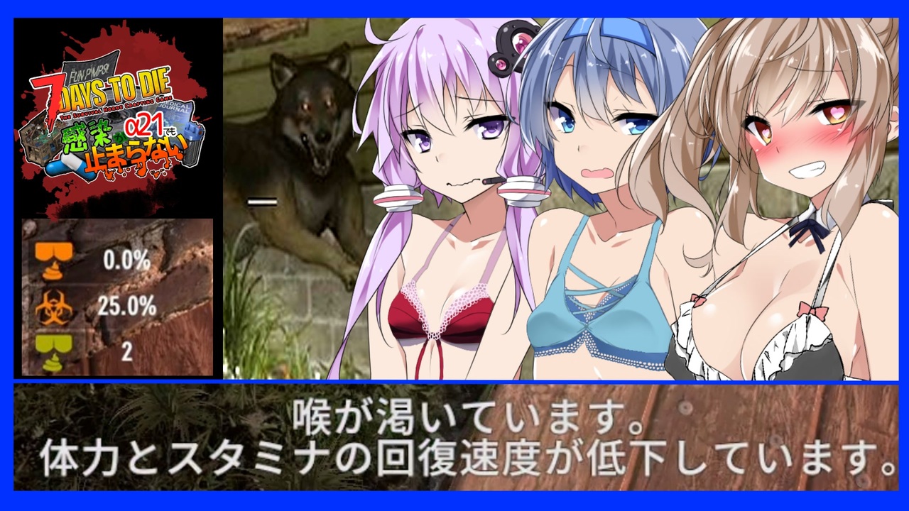 一通り設備を揃えてから初歩的な設備を作る。順番<strong>も</strong>ガバガバです。<br>今週は赤痢デバフ中ですので水不足が本当に深刻です!<br><br>目標<br>・50日で77の目標を完了します。<br><br>ルール<br>・自作感染MOD導入した上で冒険者難易度ノーデス縛りです。<br>・77の目標を毎週11づつこなしていきます。<br>・毎週過不足した分翌週でペナルティを受けます。<br>・7日ごとに感染スピードが1.2倍かつ7%ずつ治らない感染が増えていきます。<br>・抗生物質は10%回復に弱体化、ゾンビの与える感染は10倍に強化しています。<br><span style="font-size: 18px;"><strong>・浄水器改造パーツは禁止とします(川の水飲み放題になってしまうので)</strong></span><br><br>通常の感染縛りとなります!(通常の感染縛りってなんだよ)<br><br>結月ゆかり(淫母 A.I.Voice)、さとうささら(CevioAI 一緒に謝る)、すずきつづみ(Cevio 両手縛りケモミミ禊ウーマン)琴葉茜・葵(A.I.Voice ツッコミコミ姉妹)、東北きりたん(Voicepeak はいかわいい)、ずんだもん(なのだ) 四国めたん(ノムリッシュ翻訳)春日部つむぎ(埼玉の最強JK)ナースロボ_タイプT(へへへ)九州そら(ささやけますか)WhiteCUL(肩周りが良くなった)※VoiceVOX<br>あときれいなずんだもん・フリモメンを含みます(Voicepeak)<br><br>以上のまたしても人数が増えすぎたソフトウェアトーク実況でお送りいたします。<br><br>※グロテスク要素(欠損・首が飛んだり)が映り込んでしまうことがございます。ご注意ください。<br>※音量周りにご注意ください。<br /><span style="font-size: 16px;"><strong>バックパックサバイバーゾンビゲー</strong></span><br><span style="font-size: 18px;"><strong><a href="https://www.nicovideo.jp/watch/sm45887821" class="watch">sm45887821</a></strong></span><br><br>運全振りなThe WasteLand MOD(完結)<br><a href="https://www.nicovideo.jp/series/535958" target="_blank" rel="noopener">series/535958</a><br><br>パート1と単発まとめ<br><a href="https://www.nicovideo.jp/mylist/72399112" target="_blank" rel="noopener">mylist/72399112</a><br><br>その他<br><a href="https://www.nicovideo.jp/series/164391" target="_blank" rel="noopener">series/164391</a><br><br>ツイッター(現X)<br><a href="https://twitter.com/nec_gene" target="_blank" rel="noopener nofollow">https://twitter.com/nec_gene</a><br>ユーチューブ<br><a href="https://www.youtube.com/channel/UCTUIH2IZyXF_NY4NnUHWBWQ" target="_blank" rel="noopener nofollow">https://www.youtube.com/channel/UCTUIH2IZyXF_NY4NnUHWBWQ</a>