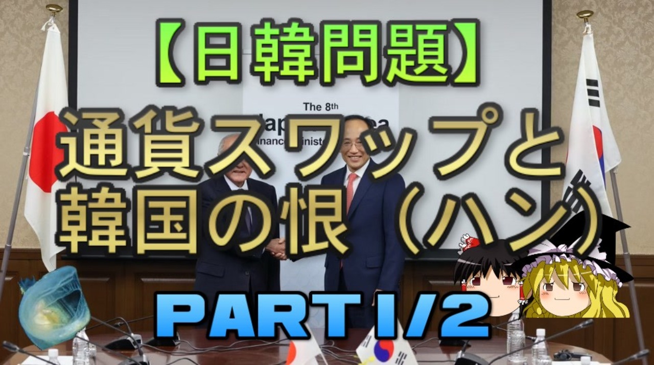 さて、本日は一連の日韓通貨スワップ再開の件について、2回に分けて扱っていきます。<br>どようび明け宣言は延期されました。<br><br>本日のブログ記事<br><a href="https://oogchib.hateblo.jp/entry/2023/07/23/205417" target="_blank" rel="noopener nofollow">https://oogchib.hateblo.jp/entry/2023/07/23/205417</a><br><br>元記事<br>日韓通貨スワップと韓国の「恨(ハン)」<br><a href="https://oogchib.hateblo.jp/entry/2023/07/06/020257" target="_blank" rel="noopener nofollow">https://oogchib.hateblo.jp/entry/2023/07/06/020257</a><br><br>関連動画<br>【日韓問題】韓国の「恨(ハン)」とは何?<br><a href="https://www.nicovideo.jp/watch/sm32098678" class="watch">sm32098678</a><br>【日韓問題】日韓で異なる「正しさ」の概念 前編<br><a href="https://www.nicovideo.jp/watch/sm31616028" class="watch">sm31616028</a><br><br><span style="color: #ff0000;">注意</span><br>・この動画は「日韓の価値観の違い」を扱っています<br><br>・うp主のスタンスは「価値観に善悪や優劣は存在しない」というものです<br><br>・相手が不法を働いているからとこちらが不法をして良い理由にはなりません<br><br>・自身の常識が相手にとっても常識とは限りません、「他者がそれを見たら<br>どう思うか」という客観性を常に持ちましょう。<br><br>・日常生活で注意する程度には言動に注意を心がけてください<br><br>・リクエストは原則受け付けていません<br><br>・引用ソースへのリンクが同時掲載のブログにあります<br><br>・毎週日曜日更新<br><br>引用ソースと動画のテキストをブログ日韓問題(初心者向け)のほうへ掲載しています。<br><br>日韓問題(初心者向け)<br><a href="https://oogchib.hateblo.jp/" target="_blank" rel="noopener nofollow">https://oogchib.hateblo.jp/</a><br><br>暇つぶしにどうぞ<br><a href="http://ooguchib.blog.fc2.com/" target="_blank" rel="noopener nofollow">http://ooguchib.blog.fc2.com/</a> <br><br>twitter @ooguchib<br><a href="https://twitter.com/ooguchib" target="_blank" rel="noopener nofollow">https://twitter.com/ooguchib</a><br><br>前 <a href="https://www.nicovideo.jp/watch/sm42492621" class="watch">sm42492621</a> <a href="https://www.nicovideo.jp/mylist/59069876" target="_blank" rel="noopener">mylist/59069876</a> 次 <a href="https://www.nicovideo.jp/watch/sm42551614" class="watch">sm42551614</a><br><br>番外編マイリスト<br><a href="https://www.nicovideo.jp/mylist/62992608" target="_blank" rel="noopener">mylist/62992608</a><br><br>YouTube版<br><a href="https://youtu.be/NQdW0cJe1Wk" target="_blank" rel="noopener nofollow">https://youtu.be/NQdW0cJe1Wk</a>