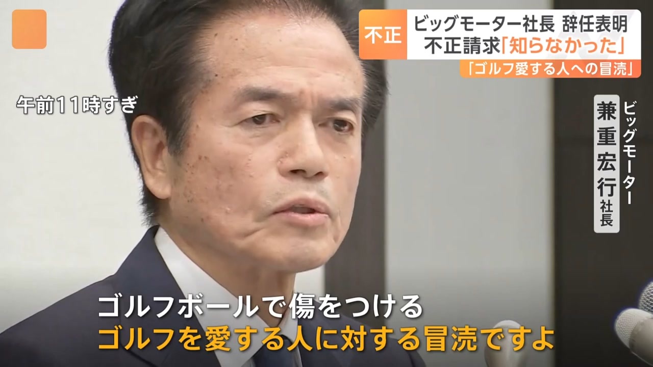 「こんなことまでやるのかと、愕然とした」 ビッグモーター社長が辞任表明 不正行為について「天地神明に誓って知らなかった」|TBS NEWS DIG<br>(<a href="https://www.youtube.com/watch?v=y97axW-b9ok)" target="_blank" rel="noopener nofollow">https://www.youtube.com/watch?v=y97axW-b9ok)</a><br><br>連日お伝えしている、中古車販売大手ビッグモーターの保険金不正請求問題。きょうようやく会見を開き、社長が辞任すると表明しました。しかし、不正は「知らなかった」と繰り返しました。<br>渦中の人物がようやく公の場に現れました。<br>ビッグモーター 兼重宏行社長<br>「深くお詫び申し上げます。誠に申し訳ございませんでした。私は7月26日付で代表取締役社長を辞任することとした」<br>靴下に入れたゴルフボールで車を叩くなどして、車をわざと傷つけ保険金を不正に請求していたことが分かっていますが、こうした不正行為は知らなかったといいます。<br>ビッグモーター 兼重宏行社長<br>「板金塗装部門単独で、他の経営者は知らなかった。耳を疑った。こんなことまでやるのかと愕然としましたね。大切な客の車をお預かりして、これから修理する人間が傷をつけて水増し請求をする。ありえんですよ。本当に許しがたい。天地神明に誓って知りませんでした」<br>さらに…<br>ビッグモーター 兼重宏行社長<br>「ゴルフボールを靴下にいれて振り回して、ひょう害車の損傷範囲を広げて水増し請求する。本当に許せません。ゴルフボールで傷をつける。ゴルフを愛する人に対する冒涜ですよ」<br>不正は一部門によるもので、兼重社長は知らなかったと終始主張しました。<br>一方、不正請求問題は損保業界も揺るがしています。<br>損保各社とビッグモーターは保険代理店の契約を結び、ビッグモーターは紹介された数に応じて自賠責保険の契約を割り振っていました。幹事保険会社として、ビッグモーターにこれまで37人の出向者を出していた「損保ジャパン」の社長はけさ…<br>損保ジャパン 白川儀一社長<br>「会社として見抜けなかったことは、ものすごく申し訳ない。そこまでのことが起きているというのは…そこまではというのは正直、非常に遺憾であると感じている。ビッグモーターの工場長からそういう指示があったということを把握していたと、経営にも連絡があった。ゴルフボールの例は極端かもしれませんが、一緒になってやっていた人はひとりも出てきていない」<br>出向者は不正の現場に立ち入れず、不正は「知りようがなかった」と説明、調査委員会を設置するといいます。<br>ビッグモーターも損保会社もトップは“知らなかった”とする不正請求問題。金融庁が事実確認を進めているほか、国交省はあす、ビッグモーターへの聞き取り調査を行います。