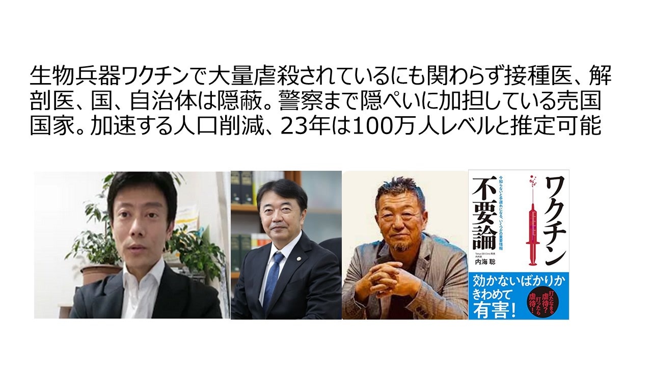 【大阪府庁】で新型コロナワクチン被害救済認定 報告記者会見<br>日時:2023年7月24日(月)14:00開始 場所:大阪府庁4階記者会見ルーム登壇:河野明樹子 被害者遺族<br> 弁護団 青山雅幸弁護士 NPO法人駆け込み寺2020理事長 鵜川和久<br><a href="https://www.nicovideo.jp/watch/sm42524831" target="_blank" rel="noopener nofollow">https://www.nicovideo.jp/watch/sm42524831</a><br><br>鳴りやまぬ救急車。22年は21年より103万件増加したと言いましたが、5月以降の接種が7月25日時点で、296万回となり16.6%の接種。高齢者接種は1820万回と高齢者の接種率が50.7%と半数を超えました。これに秋接種が加われば間違いなく今年の超過死亡は高まり、人口減少は加速すると思います。おさらいですが、20年は超過死亡が-6700人。生物兵器ワクチンを打ち21年は6.7万人。22年は13万人でした。人口減少は20年53万人。21年63万人。22年約80万人でした。コロナ元年超過死亡は発生しなかっただけではなく、人口減数は19年と20年は同じ50万人台でした。ところが21年は約10万減少が増え、22年は17万人も人口減が増えました。今年去年より17万人多く人口減少するとほぼ100万人の減少となります。私は今年100万人程度の人口減少を予想します。<br>100万人あたりの県は13県あり、鳥取の倍程度となります。<br>一回目接種率が0.4%下がっていることを谷本誠一先生との対談でも説明しましたが、<br>時差があるので、2回目接種率も今日0.4%下がりました。<br><a href="https://www.kantei.go.jp/jp/headline/kansensho/vaccine.html" target="_blank" rel="noopener nofollow">https://www.kantei.go.jp/jp/headline/kansensho/vaccine.html</a><br>