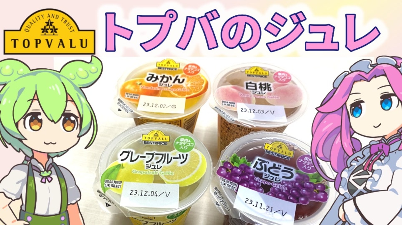 山形県の和歌山産業株式会社が作っています。<br><br><br>【参考】<br>白桃ジュレ(トップバリュ)<br><a href="https://www.topvalu.net/items/detail/4549414387179/" target="_blank" rel="noopener nofollow">https://www.topvalu.net/items/detail/4549414387179/</a><br>みかんジュレ(トップバリュ)<br><a href="https://www.topvalu.net/items/detail/4549414387162/" target="_blank" rel="noopener nofollow">https://www.topvalu.net/items/detail/4549414387162/</a><br>グレープフルーツジュレ(トップバリュ)<br><a href="https://www.topvalu.net/items/detail/4549414387155/" target="_blank" rel="noopener nofollow">https://www.topvalu.net/items/detail/4549414387155/</a><br>ぶどうジュレ(トップバリュ)<br><a href="https://www.topvalu.net/items/detail/4549414387186/" target="_blank" rel="noopener nofollow">https://www.topvalu.net/items/detail/4549414387186/</a><br>和歌山産業Q&A<br><a href="https://www.zao-highland.com/qa/" target="_blank" rel="noopener nofollow">https://www.zao-highland.com/qa/</a><br>1993年/流行・出来事(年代流行)<br><a href="https://nendai-ryuukou.com/1990/1993.html" target="_blank" rel="noopener nofollow">https://nendai-ryuukou.com/1990/1993.html</a><br>ジュレ(patissient)<br><a href="https://www.patissient.com/wiki/%E3%82%B8%E3%83%A5%E3%83%AC" target="_blank" rel="noopener nofollow">https://www.patissient.com/wiki/%E3%82%B8%E3%83%A5%E3%83%AC</a><br>ゼリーとジュレの違い|日本での使われ方は?(北の菓子 菓風)<br><a href="https://kitanokashi-kafuu.com/%E3%82%BC%E3%83%AA%E3%83%BC%E3%81%A8%E3%82%B8%E3%83%A5%E3%83%AC%E3%81%AE%E9%81%95%E3%81%84%EF%BD%9C%E6%97%A5%E6%9C%AC%E3%81%A7%E3%81%AE%E4%BD%BF%E3%82%8F%E3%82%8C%E6%96%B9%E3%81%AF%EF%BC%9F/" target="_blank" rel="noopener nofollow">https://kitanokashi-kafuu.com/%E3%82%BC%E3%83%AA%E3%83%BC%E3%81%A8%E3%82%B8%E3%83%A5%E3%83%AC%E3%81%AE%E9%81%95%E3%81%84%EF%BD%9C%E6%97%A5%E6%9C%AC%E3%81%A7%E3%81%AE%E4%BD%BF%E3%82%8F%E3%82%8C%E6%96%B9%E3%81%AF%EF%BC%9F/</a><br>着色料の種類(グリコ栄養食品たべもの辞典)<br><a href="https://www.glico.com/nutrition/tabemono/material/03/01/index.html" target="_blank" rel="noopener nofollow">https://www.glico.com/nutrition/tabemono/material/03/01/index.html</a><br><br><br><br>【使用した素材】(※敬称略)<br>(合成音声)VOICEVOX/ずんだもん/四国めたん<br><a href="https://voicevox.hiroshiba.jp/" target="_blank" rel="noopener nofollow">https://voicevox.hiroshiba.jp/</a><br>(立ち絵)坂本アヒル<br><a href="https://seiga.nicovideo.jp/seiga/im10788496" target="_blank" rel="noopener">im10788496</a>/<a href="https://seiga.nicovideo.jp/seiga/im10791276" target="_blank" rel="noopener">im10791276</a><br>(楽曲)甘茶の音楽工房/「楽しい麦畑」「フルーツパフェ」<br><a href="https://amachamusic.chagasi.com/" target="_blank" rel="noopener nofollow">https://amachamusic.chagasi.com/</a>