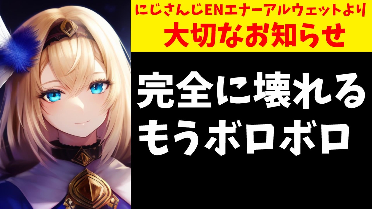 2023年7月26日、にじさんじENのエナ―・アールウェットさんから大切なお知らせの発表がありました。<br><br>引用<br><a href="https://twitter.com/EnnaAlouette/status/1683879282957860865" target="_blank" rel="noopener nofollow">https://twitter.com/EnnaAlouette/status/1683879282957860865</a><br><a href="https://twitter.com/EnnaAlouette/status/1683883894964203532" target="_blank" rel="noopener nofollow">https://twitter.com/EnnaAlouette/status/1683883894964203532</a><br><br>Youtube <a href="https://www.youtube.com/@V_Virgin_Mary" target="_blank" rel="noopener nofollow">https://www.youtube.com/@V_Virgin_Mary</a><br>twitter <a href="https://twitter.com/V_Virgin_Mary" target="_blank" rel="noopener nofollow">https://twitter.com/V_Virgin_Mary</a><br><br>使用素材<br>高品質なフリー動画素材 - Pixabay <a href="https://pixabay.com/ja/videos" target="_blank" rel="noopener nofollow">https://pixabay.com/ja/videos</a>