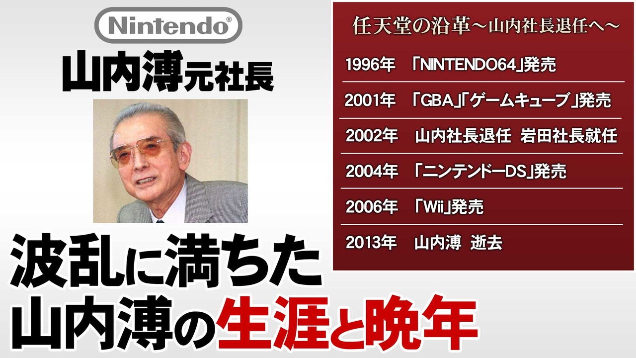 前回の動画にギフト・ニコニ広告して下さった方、ありがとうございました。<br>原則、「前編」「後編」合わせて毎回約30分を予定しています。<br><br>▼第149回「山内溥任天堂元社長~組長と呼ばれた男」<br>前編:<a href="https://www.nicovideo.jp/watch/sm42487677" class="watch">sm42487677</a><br>中編:<a href="https://www.nicovideo.jp/watch/sm42516860" class="watch">sm42516860</a><br><br>▼関連動画<br>「プレステ誕生物語」<a href="https://www.nicovideo.jp/watch/sm39632567" class="watch">sm39632567</a><br>「ファミコン誕生物語」<a href="https://www.nicovideo.jp/watch/sm39063573" class="watch">sm39063573</a><br>「横井軍平さん特集」<a href="https://www.nicovideo.jp/watch/sm39115483" class="watch">sm39115483</a><br>「岩田聡元社長特集」<a href="https://www.nicovideo.jp/watch/sm41963805" class="watch">sm41963805</a><br><br>■youtubeはこちら <a href="https://youtu.be/3xVpGF3n1C8" target="_blank" rel="noopener nofollow">https://youtu.be/3xVpGF3n1C8</a><br>■ゲーム夜話ツイッター <a href="https://twitter.com/gameyawa" target="_blank" rel="noopener nofollow">https://twitter.com/gameyawa</a><br><br>▼主な参考資料<br>「任天堂驚きを生む方程式」井上理著<br>「ゲーム・オーバー任天堂帝国を築いた男たち」デヴィッド・シェフ著<br>「任天堂ノスタルジー 横井軍平とその時代」牧野武文著<br>※他、各種インタビューなど