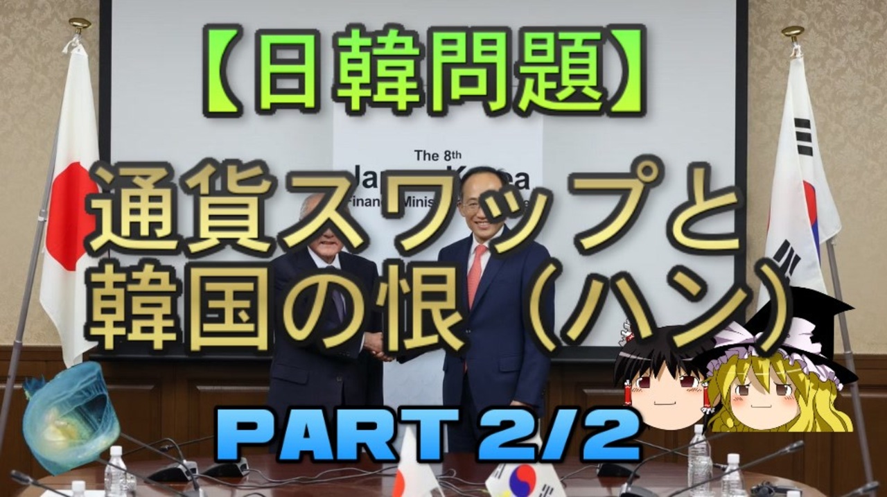 さて、本日は前回に引き続き通貨スワップと韓国の「恨(ハン)」について扱っていきます。<br>どようびトッピング追加無料<br><br>本日のブログ記事<br><a href="https://oogchib.hateblo.jp/entry/2023/07/30/211159" target="_blank" rel="noopener nofollow">https://oogchib.hateblo.jp/entry/2023/07/30/211159</a><br><br>元記事<br>日韓通貨スワップと韓国の「恨(ハン)」<br><a href="https://oogchib.hateblo.jp/entry/2023/07/06/020257" target="_blank" rel="noopener nofollow">https://oogchib.hateblo.jp/entry/2023/07/06/020257</a><br><br>関連動画<br>【日韓問題】韓国の「恨(ハン)」とは何?<br><a href="https://www.nicovideo.jp/watch/sm32098678" class="watch">sm32098678</a><br>【日韓問題】韓国人は記憶の改変をしているわけではない?<br><a href="https://www.nicovideo.jp/watch/sm35775418" class="watch">sm35775418</a><br><br>注意<br>・この動画は「日韓の価値観の違い」を扱っています<br><br>・うp主のスタンスは「価値観に善悪や優劣は存在しない」というものです<br><br>・相手が不法を働いているからとこちらが不法をして良い理由にはなりません<br><br>・自身の常識が相手にとっても常識とは限りません、「他者がそれを見たら<br>どう思うか」という客観性を常に持ちましょう。<br><br>・日常生活で注意する程度には言動に注意を心がけてください<br><br>・リクエストは原則受け付けていません<br><br>・引用ソースへのリンクが同時掲載のブログにあります<br><br>・毎週日曜日更新<br><br><br>引用ソースと動画のテキストをブログ日韓問題(初心者向け)のほうへ掲載しています。<br><br>日韓問題(初心者向け)<br><a href="https://oogchib.hateblo.jp/" target="_blank" rel="noopener nofollow">https://oogchib.hateblo.jp/</a><br><br>暇つぶしにどうぞ<br><a href="http://ooguchib.blog.fc2.com/" target="_blank" rel="noopener nofollow">http://ooguchib.blog.fc2.com/</a> <br><br>twitter @ooguchib<br><a href="https://twitter.com/ooguchib" target="_blank" rel="noopener nofollow">https://twitter.com/ooguchib</a><br><br>前 <a href="https://www.nicovideo.jp/watch/sm42522084" class="watch">sm42522084</a> <a href="https://www.nicovideo.jp/mylist/59069876" target="_blank" rel="noopener">mylist/59069876</a> 次 <a href="https://www.nicovideo.jp/watch/sm42588011" class="watch">sm42588011</a><br><br>番外編マイリスト<br><a href="https://www.nicovideo.jp/mylist/62992608" target="_blank" rel="noopener">mylist/62992608</a><br><br>YouTube版<br><a href="https://youtu.be/uKI3AcScP5Q" target="_blank" rel="noopener nofollow">https://youtu.be/uKI3AcScP5Q</a><br>