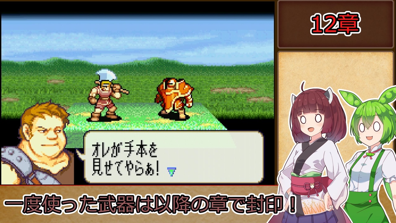 <span style="color: #85200c; font-size: 24px;"><strong><i>この章から移動範囲や能力確認の時間を<br>カットしております</i></strong></span><br><br><strong>ルール1:一度使用した武器種は、以降の章で使用する事を禁止する。<br>ルール2:武器の使用の定義は『その武器を装備した状態で敵との戦闘が発生したタイミング』『その武器を売却して換金した場合』杖の場合は『対象に対して使用した時点(命中の可否は問わない)』とする。</strong><br><span style="color: #ff0000;"><strong>※同盟軍、演出による戦闘イベントでは使用した判定にはならないこととする。</strong></span><br><strong>ルール3:難易度はリン編ハード→ヘクトル編ハードとする。<br>ルール4:序章から終章まで外伝、異伝を含む全ての章を攻略し、仲間に出来るユニットは全員加入させ、生存させる。(序章と1章のみ同一の章として扱う)</strong><br><span style="color: #ff0000; font-size: 18px;"><strong>※バグ技禁止</strong></span><br><br>本動画のシリーズリスト【<a href="https://www.nicovideo.jp/series/406473" target="_blank" rel="noopener">series/406473</a>】<br>前作の同縛りプレイ【<a href="https://www.nicovideo.jp/series/316824" target="_blank" rel="noopener">series/316824</a>】<br>前:【<a href="https://www.nicovideo.jp/watch/sm42520574" class="watch">sm42520574</a>】次:【<a href="https://www.nicovideo.jp/watch/sm42587270" class="watch">sm42587270</a>】<br><br><strong>使用したソフト</strong><br>VOICEROID+東北きりたんEX<br>VOICEPEAK 東北きりたん<br>VOICEPEAK ずんだもん<br><strong>お借りした素材</strong><br>ニコニコモンズの皆様(コンテンツツリー参照)