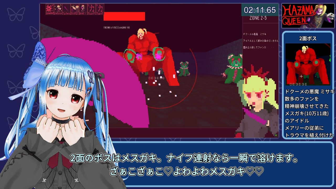 もぅマヂ無理。。。さっじんしょ。。。<br><br><strong><u>レギュレーション<br>難易度:イージィ↑↑<br>計測区間:難易度選択~ラスボス撃破後"You killed it!"の文字が出るまで</u></strong><br><br>ゲーム正式名:HAZAMA_QUEEN<br>製作者兄貴(bhaskara氏)のニコニコアカウント→<a href="https://www.nicovideo.jp/user/66618998" target="_blank" rel="noopener">user/66618998</a><br>先駆者兄貴→<a href="https://www.nicovideo.jp/watch/sm42339217" class="watch">sm42339217</a><br><br>タイマー付けただけ版→<a href="https://youtu.be/XkAY94LKtiA" target="_blank" rel="noopener nofollow">https://youtu.be/XkAY94LKtiA</a><br><br>前→<a href="https://www.nicovideo.jp/watch/sm42497216" class="watch">sm42497216</a><br>次→<a href="https://www.nicovideo.jp/watch/sm42618659" class="watch">sm42618659</a><br>RTAマイリス→<a href="https://www.nicovideo.jp/mylist/74656323" target="_blank" rel="noopener">mylist/74656323</a><br><br><span style="font-size: 24px;">前回動画を20分無慈悲した無慈悲兄貴(298兄貴)→<a href="https://www.nicovideo.jp/watch/sm42523444" class="watch">sm42523444</a></span><br><br>没ゲーム紹介のコーナー(侍剣劇 Samurai Sword Stage)<br>→<a href="https://store.steampowered.com/app/2294030/Samurai_Sword_Stage/" target="_blank" rel="noopener nofollow">https://store.steampowered.com/app/2294030/Samurai_Sword_Stage/</a><br><br><u>使用させていただいた素材・ソフト等</u><br>AviUtl<br>A.I.VOICE 琴葉葵<br>VOICEVOX WhiteCUL、ちび式じい<br>COEIROINK 松嘩りすく、ディアちゃん、アルマちゃん<br>COM3D2(VAS使用)<br>OtoLogic様<br>甘茶の音楽工房様<br><br>その他お借りした素材はコンテンツツリーをご覧ください。<br><br>追記:ま~た無慈悲されました→<a href="https://www.nicovideo.jp/watch/sm42588327" class="watch">sm42588327</a><br /><br>ついった(旧Twitter):<a href="https://twitter.com/tsubame_sizimi" target="_blank" rel="noopener nofollow">https://twitter.com/tsubame_sizimi</a><br><br><a target="_blank" href="https://qa.nicovideo.jp/faq/show/19424?site_domain=default" style="font-size: 13px;color: #657586; text-decoration: underline; line-height: 1.4">この動画は投稿者によって修正されました</a>