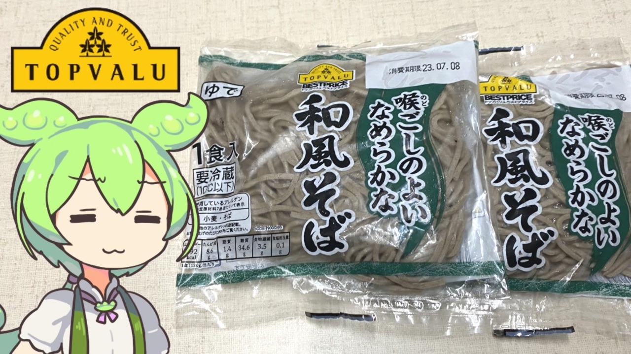 「喉ごしの良いなめらかな和風そば」(※商品名)<br><br><br>【参考】<br>喉ごしのよいなめらかな和風そば(トップバリュ)<br><a href="https://www.topvalu.net/items/detail/4549741943550/" target="_blank" rel="noopener nofollow">https://www.topvalu.net/items/detail/4549741943550/</a><br>岡井食産株式会社<br><a href="https://www.okai-syokusan.co.jp/index.html" target="_blank" rel="noopener nofollow">https://www.okai-syokusan.co.jp/index.html</a><br><br><br>【使用した素材】(※敬称略)<br>(合成音声)VOICEVOX/ずんだもん/四国めたん/<br><a href="https://voicevox.hiroshiba.jp/" target="_blank" rel="noopener nofollow">https://voicevox.hiroshiba.jp/</a><br>(立ち絵)坂本アヒル<br><a href="https://seiga.nicovideo.jp/seiga/im10788496" target="_blank" rel="noopener">im10788496</a>/<a href="https://seiga.nicovideo.jp/seiga/im10791276" target="_blank" rel="noopener">im10791276</a><br>(楽曲)甘茶の音楽工房/「楽しい麦畑」「フルーツパフェ」<br><a href="https://amachamusic.chagasi.com/" target="_blank" rel="noopener nofollow">https://amachamusic.chagasi.com/</a><br><br><br>【関連動画】<br>トップバリュの黄色いヤツで作る『やきそば』<br><a href="https://www.youtube.com/watch?v=ZkrE8l5FFUw&t=19s" target="_blank" rel="noopener nofollow">https://www.youtube.com/watch?v=ZkrE8l5FFUw&t=19s</a><br>トップバリュの黄色いヤツ「もっちりしてこしのあるうどん(半額)」<br><a href="https://www.youtube.com/watch?v=GeJ3kN3f9Gc&t=2s" target="_blank" rel="noopener nofollow">https://www.youtube.com/watch?v=GeJ3kN3f9Gc&t=2s</a><br>JR名古屋駅のきしめんの動画(0:19あたりから)<br><a href="https://www.youtube.com/watch?v=C_LaJbdozQ0" target="_blank" rel="noopener nofollow">https://www.youtube.com/watch?v=C_LaJbdozQ0</a><br><br><br><br>#ずんだもん <br>#四国めたん<br>#トップバリュ <br>#黄トプバ<br>#ゆでそば
