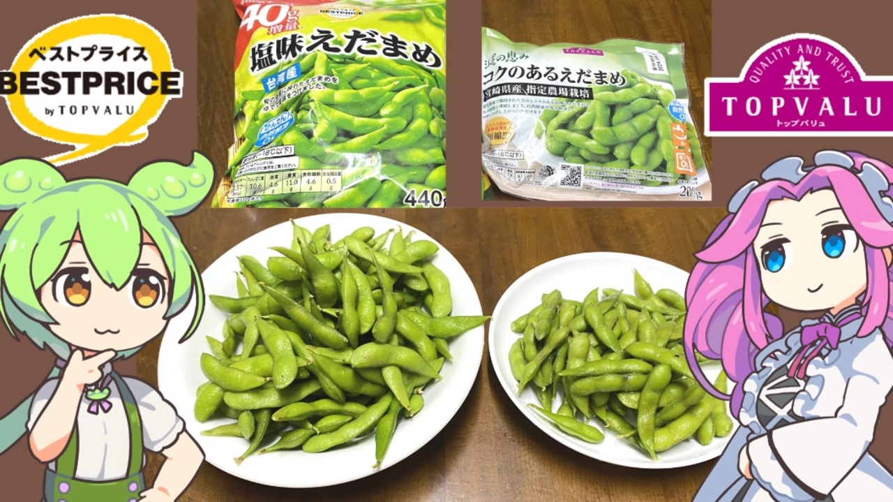台湾産と宮崎県産の冷凍枝豆です。<br><br><br>【参考】<br>塩味えだまめ+40g増量(黄トプバ:トップバリュ)<br><a href="https://www.topvalu.net/items/detail/4549414312034/" target="_blank" rel="noopener nofollow">https://www.topvalu.net/items/detail/4549414312034/</a><br>減の恵みコクのあるえだまめ 宮崎県産(赤トプバ:トップバリュ)<br><a href="https://www.topvalu.net/items/detail/4902121045600/" target="_blank" rel="noopener nofollow">https://www.topvalu.net/items/detail/4902121045600/</a><br>園芸通信 エダマメの育て方・栽培方法(サカタのタネ)<br><a href="https://sakata-tsushin.com/oyakudachi/lesson/vegetable/post_13.html" target="_blank" rel="noopener nofollow">https://sakata-tsushin.com/oyakudachi/lesson/vegetable/post_13.html</a><br>エダマメの生産量ランキング(ジャパンクロップス)<br><a href="https://japancrops.com/crops/green-soybean/prefectures/" target="_blank" rel="noopener nofollow">https://japancrops.com/crops/green-soybean/prefectures/</a><br>うちの郷土料理 ずんだ餅(農林水産省)<br><a href="https://www.maff.go.jp/j/keikaku/syokubunka/k_ryouri/search_menu/menu/zunda_mochi_miyagi.html" target="_blank" rel="noopener nofollow">https://www.maff.go.jp/j/keikaku/syokubunka/k_ryouri/search_menu/menu/zunda_mochi_miyagi.html</a><br><br><br>【使用した素材】(※敬称略)<br>(合成音声)VOICEVOX/ずんだもん/四国めたん/<br><a href="https://voicevox.hiroshiba.jp/" target="_blank" rel="noopener nofollow">https://voicevox.hiroshiba.jp/</a><br>(立ち絵)坂本アヒル<br><a href="https://seiga.nicovideo.jp/seiga/im10788496" target="_blank" rel="noopener">im10788496</a>/<a href="https://seiga.nicovideo.jp/seiga/im10791276" target="_blank" rel="noopener">im10791276</a><br>(楽曲)甘茶の音楽工房/「楽しい麦畑」「フルーツパフェ」「お城の舞踏会」<br><a href="https://amachamusic.chagasi.com/" target="_blank" rel="noopener nofollow">https://amachamusic.chagasi.com/</a><br><br><br>【関連動画】<br>トップバリュの緑のヤツ「むきえだ豆」と「カルピス」で作るずんだシャーベット<br><a href="https://www.youtube.com/watch?v=1PRwfhaApxs&t=6s" target="_blank" rel="noopener nofollow">https://www.youtube.com/watch?v=1PRwfhaApxs&t=6s</a><br><br><br>#ずんだもん <br>#四国めたん<br>#トップバリュ <br>#黄トプバ<br>#赤トプバ<br>#冷凍枝豆