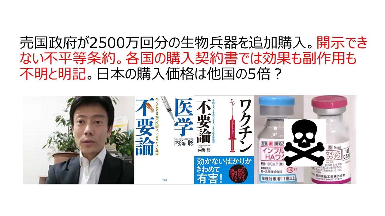 生物兵器秋の服毒用2500万回購入の発表<br><a href="https://www.sankei.com/article/20230728-RERFHDK6IJONFDUFI35DJPACGQ/" target="_blank" rel="noopener nofollow">https://www.sankei.com/article/20230728-RERFHDK6IJONFDUFI35DJPACGQ/</a><br><br>IN fact 2021ファイザーとコロンビア政府とで交わされたコロナワクチン契約書【ワクチンのファクト⑦】<br><a href="https://infact.press/2021/11/post-14514/" target="_blank" rel="noopener nofollow">https://infact.press/2021/11/post-14514/</a><br>日本とファイザーの契約書は公開されていないが、ドミニカの文書などが公開されているため、その内容を説明。アメリカの消費者団体「PUBLIC CITIZEN」が、アルバニア、ブラジル、コロンビア、チリ、ドミニカ、欧州連合、ペルー、米国、英国の9ヵ国とファイザーとの間で締結された新型コロナワクチン契約書の内容を公開した(参照)。<br><br> 「PUBLIC CITIZEN」は、ファイザーがその強い交渉力をもって各国と不公正な契約を結んでいることを問題としており、米ワシントンポスト紙も同団体が公開した内容を報じている(参照)。公開された契約書は、インターネット流出したものもあるが、中には法令にしたがって適法に開示された契約書も存在する(ドミニカ共和国の契約書、参照)。InFactでは、厚生労働省に対してワクチン契約書の情報公開請求を行ったが、契約書の内容は一切開示されることもなく、内容はおろか項目・分量等、契約に関する情報は全く分からない状況だ。<br>5条6項 購入者の認識 ⇒研究途中で副作用が分からない。要は欠陥品の可能性があるということでしょ。<br> 「購入者は、本ワクチン・その材料および構成物質等は、Covid-19のパンデミックによる緊急事態によって早急に開発されたものであり、本契約書の下で購入者に本ワクチンが供給された後も研究が継続されるものであることを認める。そして、購入者は、本ワクチンによる長期の影響および効果は現時点で不明であり、現時点で判明していない副反応が生じうることを認める。さらに、適用される限り、購入者は製品がシリアル化※されていないことを認める。」<br><br>日本国独立宣言論 私は独立を宣言する 真田信秋(紙と電子書籍)<br><a href="https://www.amazon.co.jp/dp/B0CT86DX9G/" target="_blank" rel="noopener nofollow">https://www.amazon.co.jp/dp/B0CT86DX9G/</a>