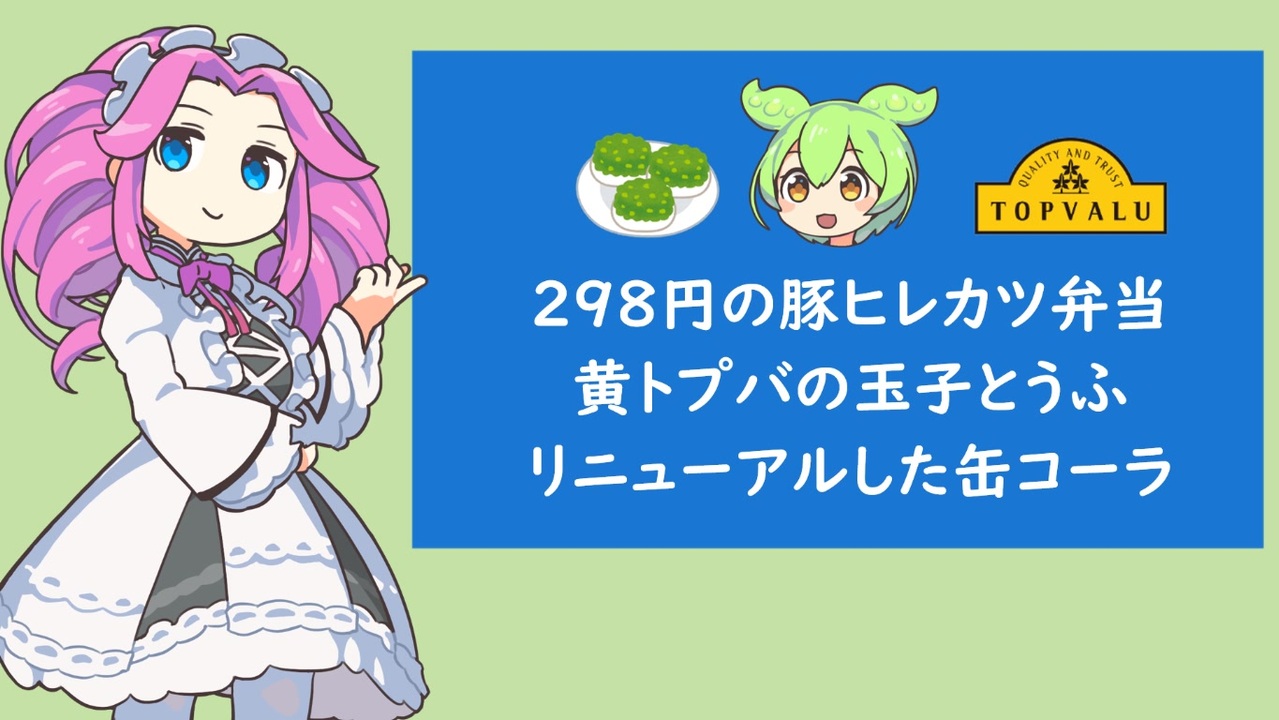 2023年7月30日はお客様感謝デー<br>今回は日曜日で土用の丑の日も重なり大盛り上がり<br>そんな中で買ってきた商品を幾つか紹介します<br><br><br>【参考】<br>ビバタイム コーラ カロリーライト(トップバリュ)<br><a href="https://www.topvalu.net/items/detail/4549414448221/" target="_blank" rel="noopener nofollow">https://www.topvalu.net/items/detail/4549414448221/</a><br>ビバタイム サイダー カロリーライト(トップバリュ)<br><a href="https://www.topvalu.net/items/detail/4549414448245/" target="_blank" rel="noopener nofollow">https://www.topvalu.net/items/detail/4549414448245/</a><br>だしをきかせたスープ付玉子とうふ(トップバリュ)<br><a href="https://www.topvalu.net/items/detail/4902121921249/" target="_blank" rel="noopener nofollow">https://www.topvalu.net/items/detail/4902121921249/</a><br>シノブフーズ(ポークヒレカツ弁当の会社さん)<br><a href="https://www.shinobufoods.co.jp/" target="_blank" rel="noopener nofollow">https://www.shinobufoods.co.jp/</a><br><br><br><br>【使用した素材】(※敬称略)<br>(合成音声)VOICEVOX/ずんだもん/四国めたん/<br><a href="https://voicevox.hiroshiba.jp/" target="_blank" rel="noopener nofollow">https://voicevox.hiroshiba.jp/</a><br>(立ち絵)坂本アヒル<br><a href="https://seiga.nicovideo.jp/seiga/im10788496" target="_blank" rel="noopener">im10788496</a>/<a href="https://seiga.nicovideo.jp/seiga/im10791276" target="_blank" rel="noopener">im10791276</a><br>(楽曲)甘茶の音楽工房/「楽しい麦畑」「フルーツパフェ」<br><a href="https://amachamusic.chagasi.com/" target="_blank" rel="noopener nofollow">https://amachamusic.chagasi.com/</a><br><br><br>【関連動画】<br>トップバリュの黄色いヤツの「サンドイッチ」<br><a href="https://www.youtube.com/watch?v=m3ofegxdpaw&t=63s" target="_blank" rel="noopener nofollow">https://www.youtube.com/watch?v=m3ofegxdpaw&t=63s</a><br>トップバリュの黄色いヤツの『おにぎり』<br><a href="https://www.youtube.com/watch?v=HleKmhF7D-o&t=36s" target="_blank" rel="noopener nofollow">https://www.youtube.com/watch?v=HleKmhF7D-o&t=36s</a><br>トップバリュの黄色いヤツ「カロリーライトのコーラとサイダー」<br><a href="https://www.youtube.com/watch?v=BdWyJFRiIgY&t=102s" target="_blank" rel="noopener nofollow">https://www.youtube.com/watch?v=BdWyJFRiIgY&t=102s</a><br><br><br><br>#ずんだもん <br>#四国めたん<br>#トップバリュ <br>#黄トプバ<br>#ビバタイム<br>#お客様感謝デー