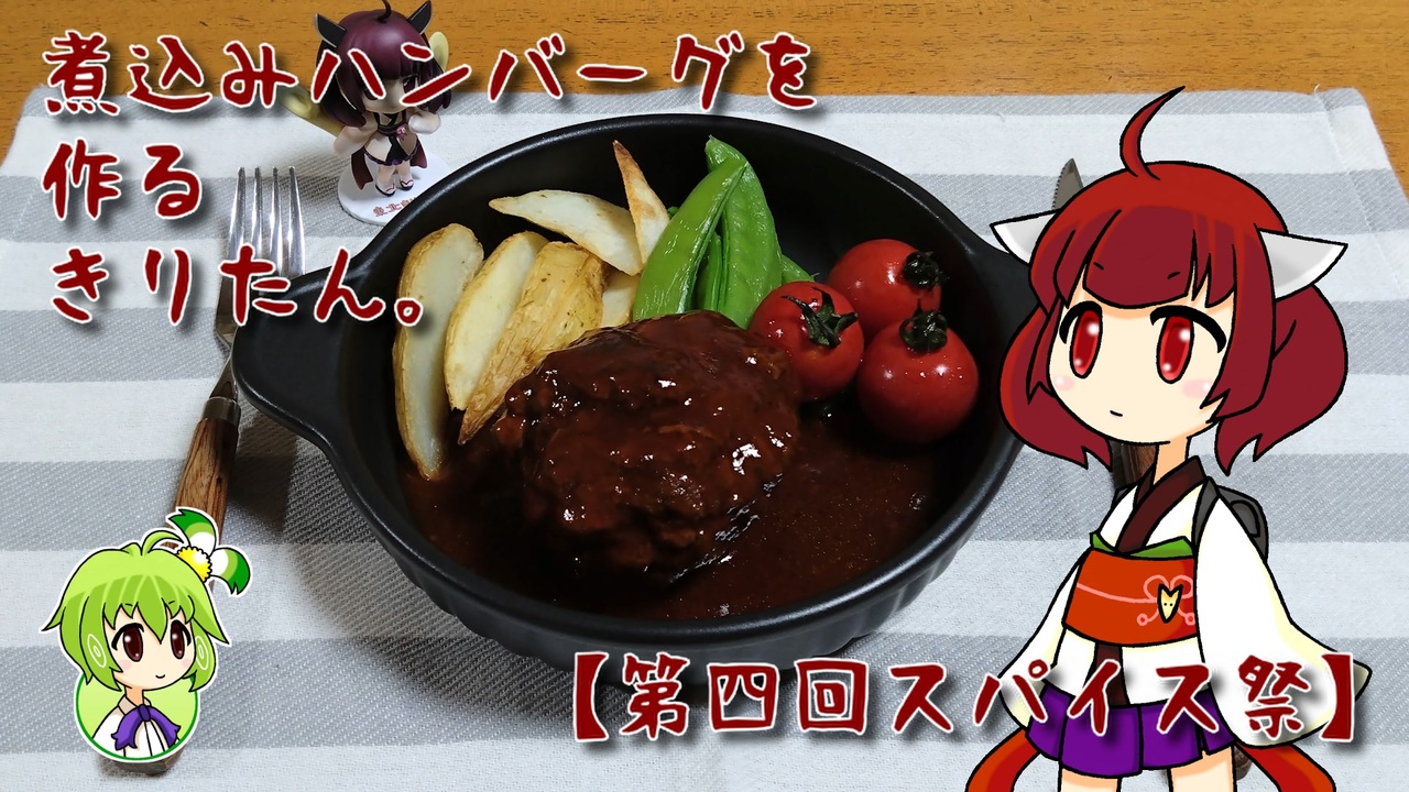 本動画は、シャル様主催の第四回スパイス祭に参加しています。<br>第四回スパイス祭の告知動画→<a href="https://www.nicovideo.jp/watch/sm42299824" class="watch">sm42299824</a><br>前回のスパイス祭(ソーセージを作るきりたん。)→<a href="https://www.nicovideo.jp/watch/sm40908402" class="watch">sm40908402</a><br>前々回のスパイス祭(カオマンガイを作るきりたん。)→<a href="https://www.nicovideo.jp/watch/sm38985755" class="watch">sm38985755</a><br><br>ハンバーグといえば柔らか食感で肉汁たっぷりのイメージですが、たまには肉の旨みとスパイスの香りが凝縮した歯ごたえのあるハンバーグも良いものです。<br><br>[レシピ]<br>合いびき肉 :400g<br>コショウ :適量<br>バジル :適量<br>ナツメグ :適量<br>クミンシード :適量<br>オールスパイス :適量<br>中濃ソース :大さじ7<br>ケチャップ :大さじ7<br>酒 :大さじ7<br>砂糖 :大さじ2<br><br>※きりたんのレンジでチン! は、特記がない限り全て600ワットです。<br><br>こちらのレシピを参考にさせて頂きました↓<br><a href="https://trilltrill.jp/articles/2869236" target="_blank" rel="noopener nofollow">https://trilltrill.jp/articles/2869236</a>