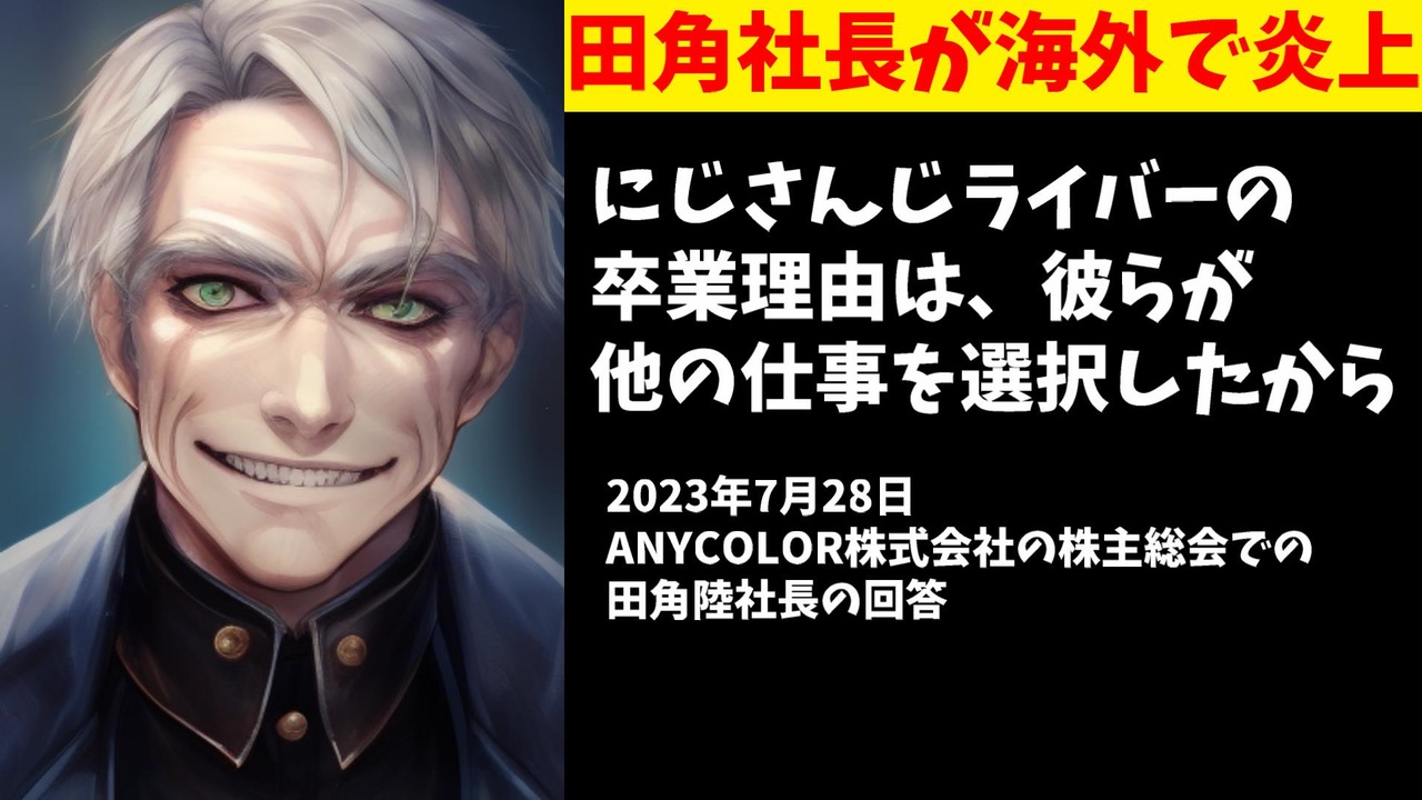 2023年7月28日、にじさんじを運営するANYCOLOR株式会社の株主総会が行われ、社長の田角陸氏が株主からの質問に答えていたのですが・・・。<br><br>引用<br><a href="https://michsuzuki.hatenablog.com/entry/2023/07/28/033652" target="_blank" rel="noopener nofollow">https://michsuzuki.hatenablog.com/entry/2023/07/28/033652</a><br><a href="https://note.com/aubin_chronology/n/nca3a9391bb09" target="_blank" rel="noopener nofollow">https://note.com/aubin_chronology/n/nca3a9391bb09</a><br><a href="https://twitter.com/NotHaru47/status/1685130464280129536" target="_blank" rel="noopener nofollow">https://twitter.com/NotHaru47/status/1685130464280129536</a><br><br>Youtube <a href="https://www.youtube.com/@V_Virgin_Mary" target="_blank" rel="noopener nofollow">https://www.youtube.com/@V_Virgin_Mary</a><br>twitter <a href="https://twitter.com/V_Virgin_Mary" target="_blank" rel="noopener nofollow">https://twitter.com/V_Virgin_Mary</a><br><br>使用素材<br>高品質なフリー動画素材 - Pixabay <a href="https://pixabay.com/ja/videos" target="_blank" rel="noopener nofollow">https://pixabay.com/ja/videos</a>