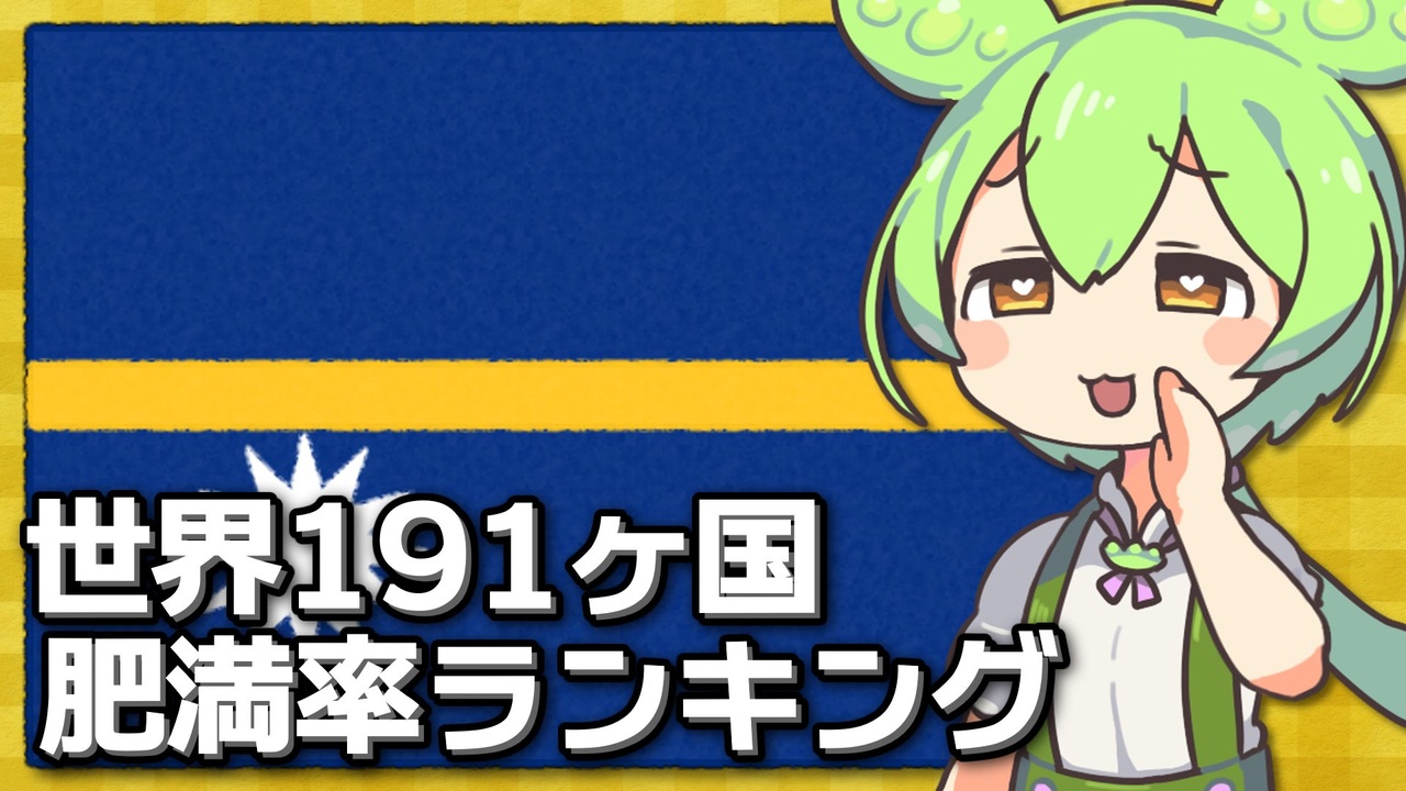 ビッグマック指数ちゃうよ<br><br>前:<a href="https://www.nicovideo.jp/watch/sm42544788" class="watch">sm42544788</a> (世界熱波)<br>次:<a href="https://www.nicovideo.jp/watch/sm42585029" class="watch">sm42585029</a> (今見たいナウル)<br>マイリスト:<a href="https://www.nicovideo.jp/mylist/73393608" target="_blank" rel="noopener">mylist/73393608</a><br><br><span style="font-size: 16px;"><strong>Our World in Data公式HPのURL(英語)</strong></span><br><a href="https://ourworldindata.org/grapher/share-of-adults-who-are-overweight?tab=table" target="_blank" rel="noopener nofollow">https://ourworldindata.org/grapher/share-of-adults-who-are-overweight?tab=table</a><br><br>使わせていただいているもの(敬称略)<br>VOICEVOX/hiho[ <a href="https://voicevox.hiroshiba.jp/" target="_blank" rel="noopener nofollow">https://voicevox.hiroshiba.jp/</a> ]<br>ずんだもん立ち絵素材/坂本アヒル[<a href="https://seiga.nicovideo.jp/seiga/im10788496" target="_blank" rel="noopener">im10788496</a>]<br>東北きりたん立ち絵素材/坂本アヒル[<a href="https://seiga.nicovideo.jp/seiga/im10559822" target="_blank" rel="noopener">im10559822</a>]<br><br>Youtube版:<a href="https://youtu.be/VyvQo9GAXZ8" target="_blank" rel="noopener nofollow">https://youtu.be/VyvQo9GAXZ8</a><br>Twitter:<a href="https://twitter.com/Yuharumuri" target="_blank" rel="noopener nofollow">https://twitter.com/Yuharumuri</a>