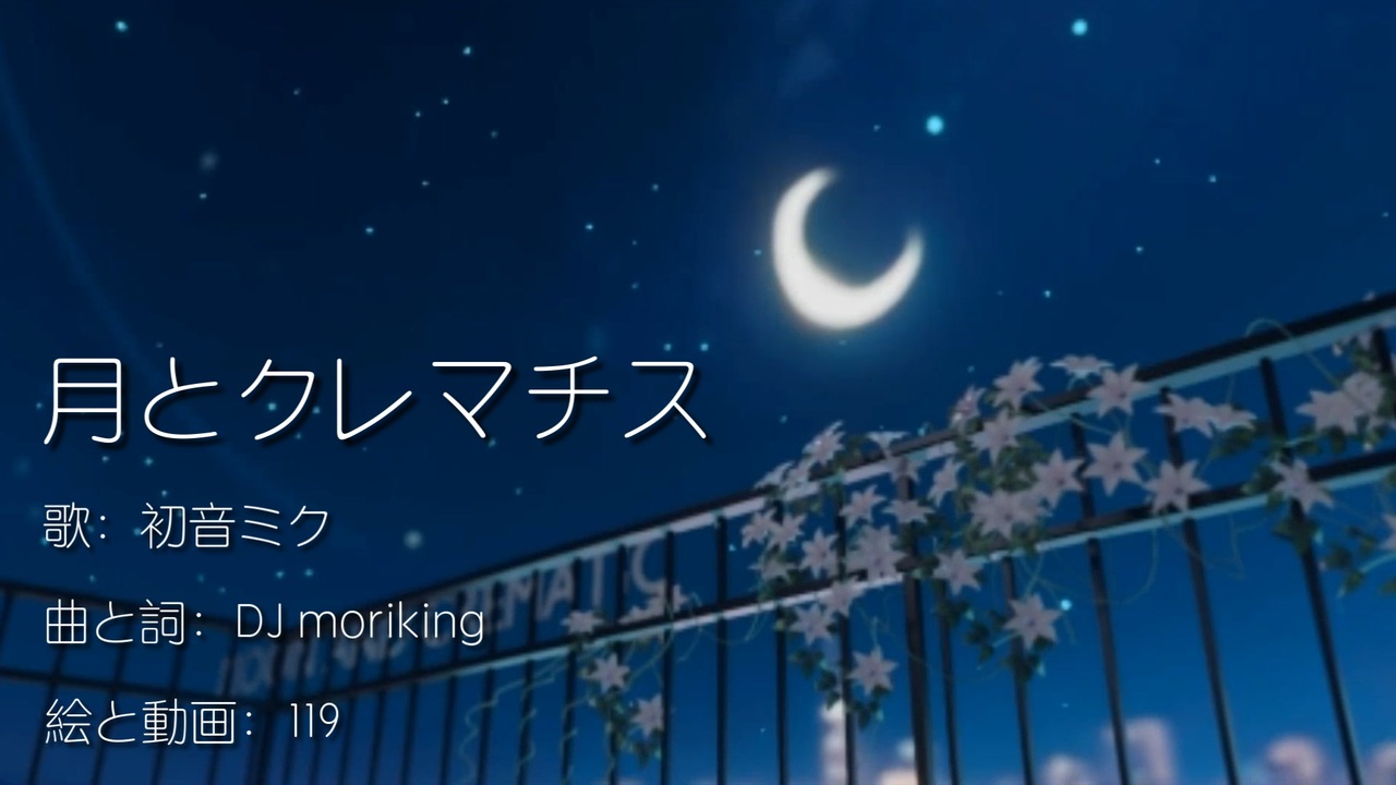 月とクレマチス <br><br>歌:初音ミク <br>作詞・作曲:DJ moriking<br>イラスト・3D動画:119<br><br><br>月とクレマチス、なんてロマンチック。 <br>Lofi Hip Hop ビート/アコギで歌えるような曲を目指しました。<br> <br>#ボカコレ2023夏 #ボカコレ2023夏TOP100 #初音ミク <br> <br />.....DJ moriking......<br>X/Twitter:<a href="https://twitter.com/DJmoriking" target="_blank" rel="noopener nofollow">https://twitter.com/DJmoriking</a><br>Youtube:<a href="https://www.youtube.com/@djmoriking5673" target="_blank" rel="noopener nofollow">https://www.youtube.com/@djmoriking5673</a><br>Niconico:<a href="https://www.nicovideo.jp/search/DJ%20moriking" target="_blank" rel="noopener nofollow">https://www.nicovideo.jp/search/DJ%20moriking</a><br> <br>