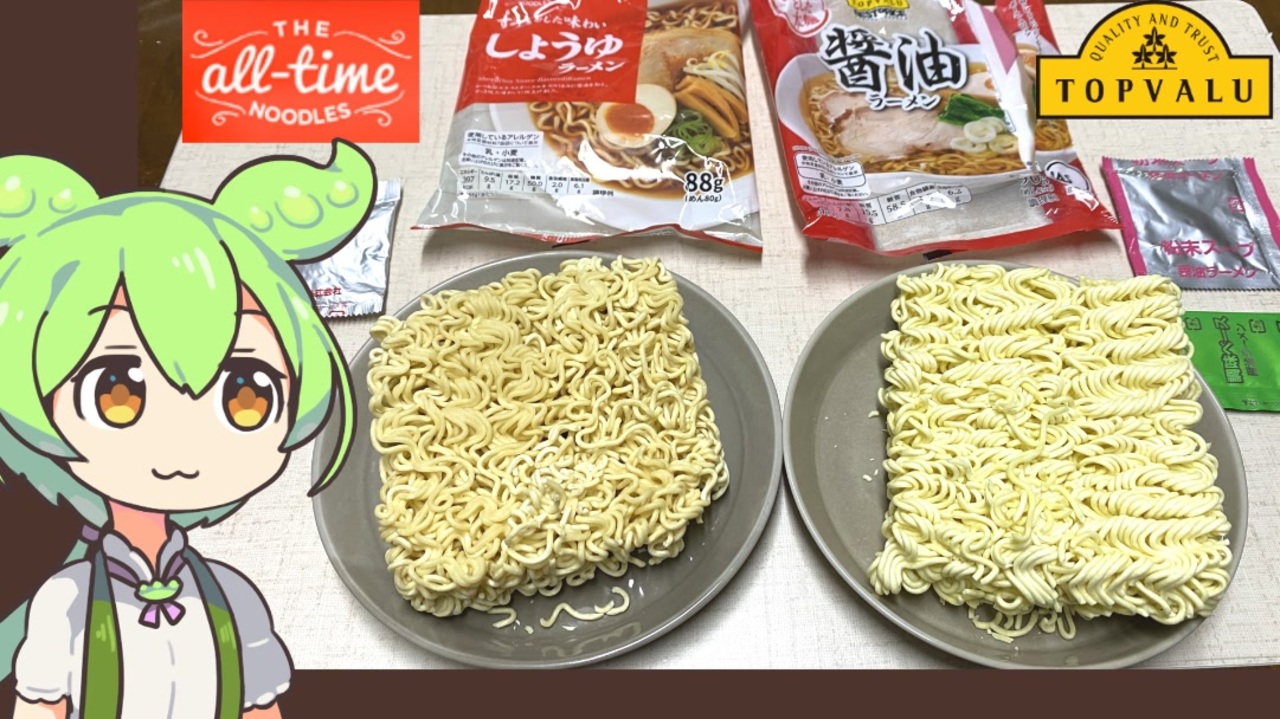 隠れトプバと黄トプバの袋ラーメンです。<br>みなさんはどんな袋麺がすきですか?わたしは出前一丁が好きです。<br><br><br>【参考】<br>オールタイムヌードル すっきりした味わい しょうゆラーメン(トップバリュ)<br><a href="https://www.topvalu.net/items/detail/4549414433845/" target="_blank" rel="noopener nofollow">https://www.topvalu.net/items/detail/4549414433845/</a><br>醤油ラーメン(トップバリュ)<br><a href="https://www.topvalu.net/items/detail/4549741020367/" target="_blank" rel="noopener nofollow">https://www.topvalu.net/items/detail/4549741020367/</a><br>株式会社つばめ食品<br><a href="https://www.tsubaro.jp/" target="_blank" rel="noopener nofollow">https://www.tsubaro.jp/</a><br>株式会社つばめ食品の株式譲受に関して(寿がきや食品株式会社PDFファイル)<br><a href="https://www.sugakiya.co.jp/special/230401_news.pdf" target="_blank" rel="noopener nofollow">https://www.sugakiya.co.jp/special/230401_news.pdf</a><br>ツバメ食品株式会社<br><a href="https://wp.tsubamesauce.com/" target="_blank" rel="noopener nofollow">https://wp.tsubamesauce.com/</a><br>満点彼氏諸君,熱海で一生の思い出作りをしようじゃないか!<br>「熱海 ラブプラス現象(まつり)キャンペーン」の見どころをレポート(4Gamer.net)<br><a href="https://www.4gamer.net/games/107/G010772/20100712002/" target="_blank" rel="noopener nofollow">https://www.4gamer.net/games/107/G010772/20100712002/</a><br><br><br><br>【使用した素材】(※敬称略)<br>(合成音声)VOICEVOX/ずんだもん/四国めたん/<br><a href="https://voicevox.hiroshiba.jp/" target="_blank" rel="noopener nofollow">https://voicevox.hiroshiba.jp/</a><br>(立ち絵)坂本アヒル<br><a href="https://seiga.nicovideo.jp/seiga/im10788496" target="_blank" rel="noopener">im10788496</a>/<a href="https://seiga.nicovideo.jp/seiga/im10791276" target="_blank" rel="noopener">im10791276</a><br>(楽曲)甘茶の音楽工房/「楽しい麦畑」「フルーツパフェ」「お城の舞踏会」<br><a href="https://amachamusic.chagasi.com/" target="_blank" rel="noopener nofollow">https://amachamusic.chagasi.com/</a><br><br><br>【関連動画】<br>トップバリュじゃないほう「オールタイムヌードルしょうゆ」とセブンプレミアムの「醤油ヌードル」<br><a href="https://www.youtube.com/watch?v=yPNLhP0zWjw&t=155s" target="_blank" rel="noopener nofollow">https://www.youtube.com/watch?v=yPNLhP0zWjw&t=155s</a><br><br><br><br>#ずんだもん <br>#四国めたん<br>#袋ラーメン <br>#隠れトプバ<br>#黄トプバ <br>#トップバリュ
