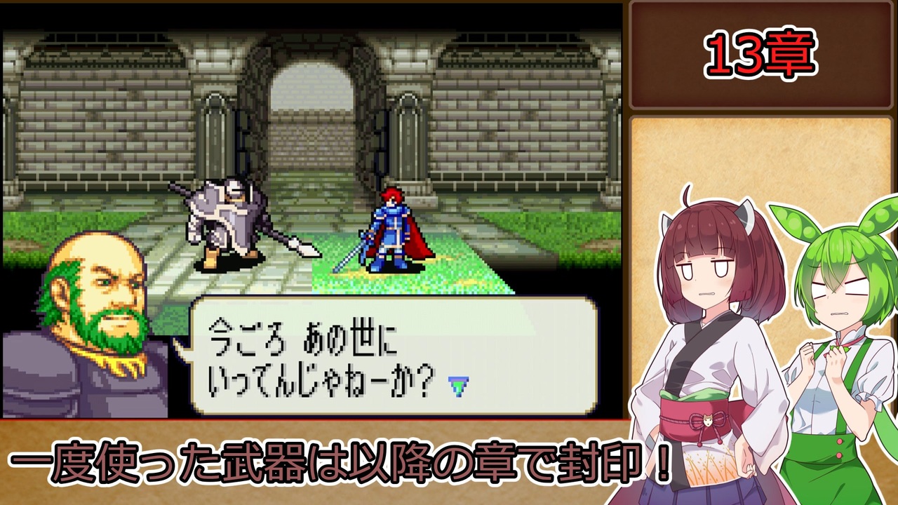 <span style="color: #85200c; font-size: 24px;"><strong><i>彼は多分n人目ですもの…</i></strong></span><br><br><strong>ルール1:一度使用した武器種は、以降の章で使用する事を禁止する。<br>ルール2:武器の使用の定義は『その武器を装備した状態で敵との戦闘が発生したタイミング』『その武器を売却して換金した場合』杖の場合は『対象に対して使用した時点(命中の可否は問わない)』とする。</strong><br><span style="color: #ff0000;"><strong>※同盟軍、演出による戦闘イベントでは使用した判定にはならないこととする。</strong></span><br><strong>ルール3:難易度はリン編ハード→ヘクトル編ハードとする。<br>ルール4:序章から終章まで外伝、異伝を含む全ての章を攻略し、仲間に出来るユニットは全員加入させ、生存させる。(序章と1章のみ同一の章として扱う)</strong><br><span style="color: #ff0000; font-size: 18px;"><strong>※バグ技禁止</strong></span><br><br>本動画のシリーズリスト【<a href="https://www.nicovideo.jp/series/406473" target="_blank" rel="noopener">series/406473</a>】<br>前作の同縛りプレイ【<a href="https://www.nicovideo.jp/series/316824" target="_blank" rel="noopener">series/316824</a>】<br>前:【<a href="https://www.nicovideo.jp/watch/sm42551853" class="watch">sm42551853</a>】次:【<a href="https://www.nicovideo.jp/watch/sm42607069" class="watch">sm42607069</a>】<br><br><strong>使用したソフト</strong><br>VOICEROID+東北きりたんEX<br>VOICEPEAK 東北きりたん<br>VOICEPEAK ずんだもん<br><strong>お借りした素材</strong><br>ニコニコモンズの皆様(コンテンツツリー参照)
