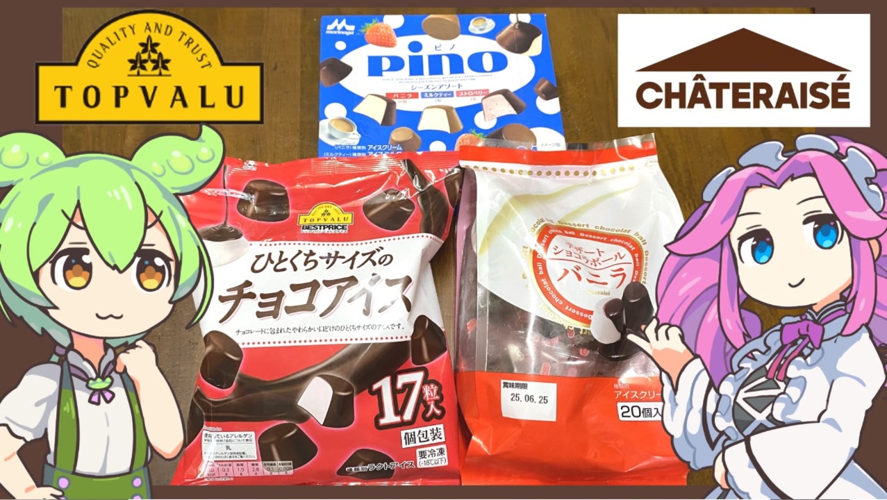 ピノに似たアイスです。<br><br><br>【参考】<br>ひとくちサイズのチョコアイス(トップバリュ)<br><a href="https://www.topvalu.net/items/detail/4549414365849/" target="_blank" rel="noopener nofollow">https://www.topvalu.net/items/detail/4549414365849/</a><br>デザートショコラボール バニラ20個入(シャトレーゼ)<br><a href="https://www.chateraise.co.jp/ec/g/g190250/" target="_blank" rel="noopener nofollow">https://www.chateraise.co.jp/ec/g/g190250/</a><br>ピノ(森永乳業)<br><a href="https://www.pinoice.com/lineup/asort.html" target="_blank" rel="noopener nofollow">https://www.pinoice.com/lineup/asort.html</a><br>シャトレーゼが全国690店舗で人材育成をデジタル化(PR TIMES)<br><a href="https://prtimes.jp/main/html/rd/p/000000054.000032315.html" target="_blank" rel="noopener nofollow">https://prtimes.jp/main/html/rd/p/000000054.000032315.html</a><br><br><br>【使用した素材】(※敬称略)<br>(合成音声)VOICEVOX/ずんだもん/四国めたん/<br><a href="https://voicevox.hiroshiba.jp/" target="_blank" rel="noopener nofollow">https://voicevox.hiroshiba.jp/</a><br>(立ち絵)坂本アヒル<br><a href="https://seiga.nicovideo.jp/seiga/im10788496" target="_blank" rel="noopener">im10788496</a>/<a href="https://seiga.nicovideo.jp/seiga/im10791276" target="_blank" rel="noopener">im10791276</a><br>(楽曲)甘茶の音楽工房/「楽しい麦畑」「フルーツパフェ」<br><a href="https://amachamusic.chagasi.com/" target="_blank" rel="noopener nofollow">https://amachamusic.chagasi.com/</a><br><br><br>【関連動画】<br>トップバリュ(赤)の「バニラアイスクリーム」<br><a href="https://www.youtube.com/watch?v=c_iLzRBc8Oc" target="_blank" rel="noopener nofollow">https://www.youtube.com/watch?v=c_iLzRBc8Oc</a><br>トップバリュの黄色いヤツ「アイスバー」<br><a href="https://www.youtube.com/watch?v=tTPAQBAVp9o&t=11s" target="_blank" rel="noopener nofollow">https://www.youtube.com/watch?v=tTPAQBAVp9o&t=11s</a><br>トップバリュの黄色いヤツ「ソフトクリーム」<br><a href="https://www.youtube.com/watch?v=xh-t2370-sU&t=39s" target="_blank" rel="noopener nofollow">https://www.youtube.com/watch?v=xh-t2370-sU&t=39s</a><br>隠れトプバの「パルムに似てるチョコレートのアイス」<br><a href="https://www.youtube.com/watch?v=MOx0yejbqi4&t=3s" target="_blank" rel="noopener nofollow">https://www.youtube.com/watch?v=MOx0yejbqi4&t=3s</a><br>トップバリュの黄色いヤツ「サクレっぽいかき氷」<br><a href="https://www.youtube.com/watch?v=R8Fb5tmjP_c" target="_blank" rel="noopener nofollow">https://www.youtube.com/watch?v=R8Fb5tmjP_c</a><br><br><br><br>#ずんだもん <br>#四国めたん<br>#アイスクリーム <br>#ピノ<br>#黄トプバ <br>#トップバリュ<br>#シャトレーゼ