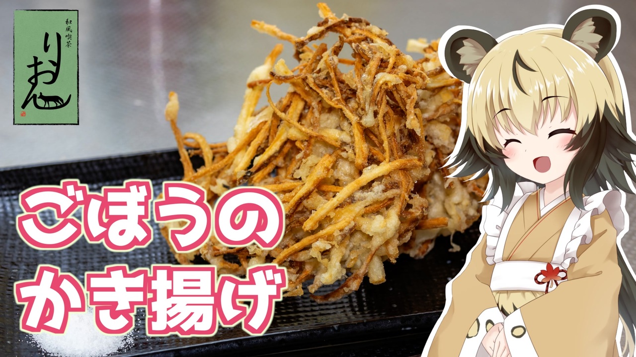 今回は、カラッと仕上がる「ごぼうのかき揚げ」です!<br><br>普段、揚げ物をやらないので、たまにかき揚げを作ると<br>表面はカラッと上がっているのに、中はちょっとべっちゃりしてて、<br>冷えるとしんなりしてしまうことが多いのです。<br><br>そこで冷えてもカラッと仕上がる方法を練習です!<br>そこまで難しい方法ではないのですが、<br>しっかりまとめるにはちょっと練習が必要ですね。<br><br>シンプルにごぼうだけのかき揚げにしてみましたが、<br>慣れてきたら、いろんな具材を混ぜて作ってみてくださいね。<br><br>■材料<br>・ごぼう お好みの量<br><br>衣<br>・卵 1個<br>・冷水 150mL<br>・薄力粉 100g<br><br><br>■所要時間<br>作業時間:20分程度<br><br>youtube:<a href="https://youtu.be/z1VlxLeEydE" target="_blank" rel="noopener nofollow">https://youtu.be/z1VlxLeEydE</a><br>twitter:@lycaon_kitchen<br><br>りおんの和風喫茶:<a href="https://www.nicovideo.jp/series/77190" target="_blank" rel="noopener">series/77190</a><br>おつかれごはん:<a href="https://www.nicovideo.jp/series/155690" target="_blank" rel="noopener">series/155690</a><br>手作り和菓子でちょっとひとやすみしませんか?:<a href="https://www.nicovideo.jp/series/155691" target="_blank" rel="noopener">series/155691</a><br><br>立ち絵:星華 彩二魔 様<br>イラスト:いらすとや、AWD kitchen<br>音源:DOVA-SYNDROME<br>音声:AI.VOICE 紲星あかり+ exVOICE