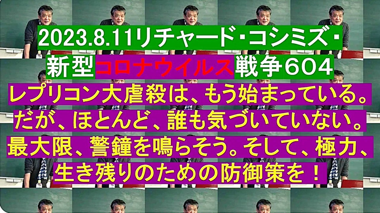 <span style="color: #cc4125;"><strong>「 テーマ : 新型コロナウイルス戦争 604 」</strong></span><br><br><span style="color: #ff0000;"><strong>「『 レプリコン大虐殺 』は、もう『 始まっている 』。だが、ほとんど、『 誰 』も『 気づいていない 』。<br> 『 最大限 』、『 警鐘 』を『 鳴らそう 』。そして、『 極力 』、『 生き残り 』のための『 防御策 』を! 」</strong></span><br><br><span style="color: #262626;"><strong>*途中、「防御策」を「ぼうえいさく」と、誤読している箇所がございます。ご了承下さい。</strong></span><br><br><span style="color: #0000ff;"><strong>「『 イベルメクチン・アビガン・その他コロナ対策 』について、ご意見をお寄せ下さい! 」<br><br> ◐ E-mail:richardkoshimizu@gmail.com</strong></span><br><br><strong>◐「クリエイター・サポート」・「ニコニ広告」・「フォロー」等、ご協力の程宜しくお願い致します。RK</strong><br><br><span style="color: #38761d;"><strong>◐ リチャード・コシミズ 講演会 公式 動画ギャラリー</strong></span><br> <span style="color: #38761d;"><strong><a href="http://www.t-sskk.com/richardkoshimizu/video-gallery/index.html" target="_blank" rel="noopener nofollow">http://www.t-sskk.com/richardkoshimizu/video-gallery/index.html</a><br><br>◐ リチャード・コシミズ 講演会 「 ニコニコ生放送『 LIVE 』」</strong></span><br> <span style="color: #38761d;"><strong><a href="https://bit.ly/3Bx8F5w" target="_blank" rel="noopener nofollow">https://bit.ly/3Bx8F5w</a><br><br>◐ リチャード・コシミズ 『 ニコニコ チャンネル 』</strong></span><br> <span style="color: #38761d;"><strong><a href="https://ch.nicovideo.jp/richardkoshimizu" target="_blank" rel="noopener nofollow">https://ch.nicovideo.jp/richardkoshimizu</a><br><br>◐ リチャード・コシミズ 公式 ブログ</strong></span><br> <span style="color: #38761d;"><strong><a href="http://08054623210.jugem.jp/" target="_blank" rel="noopener nofollow">http://08054623210.jugem.jp/</a></strong></span><br>