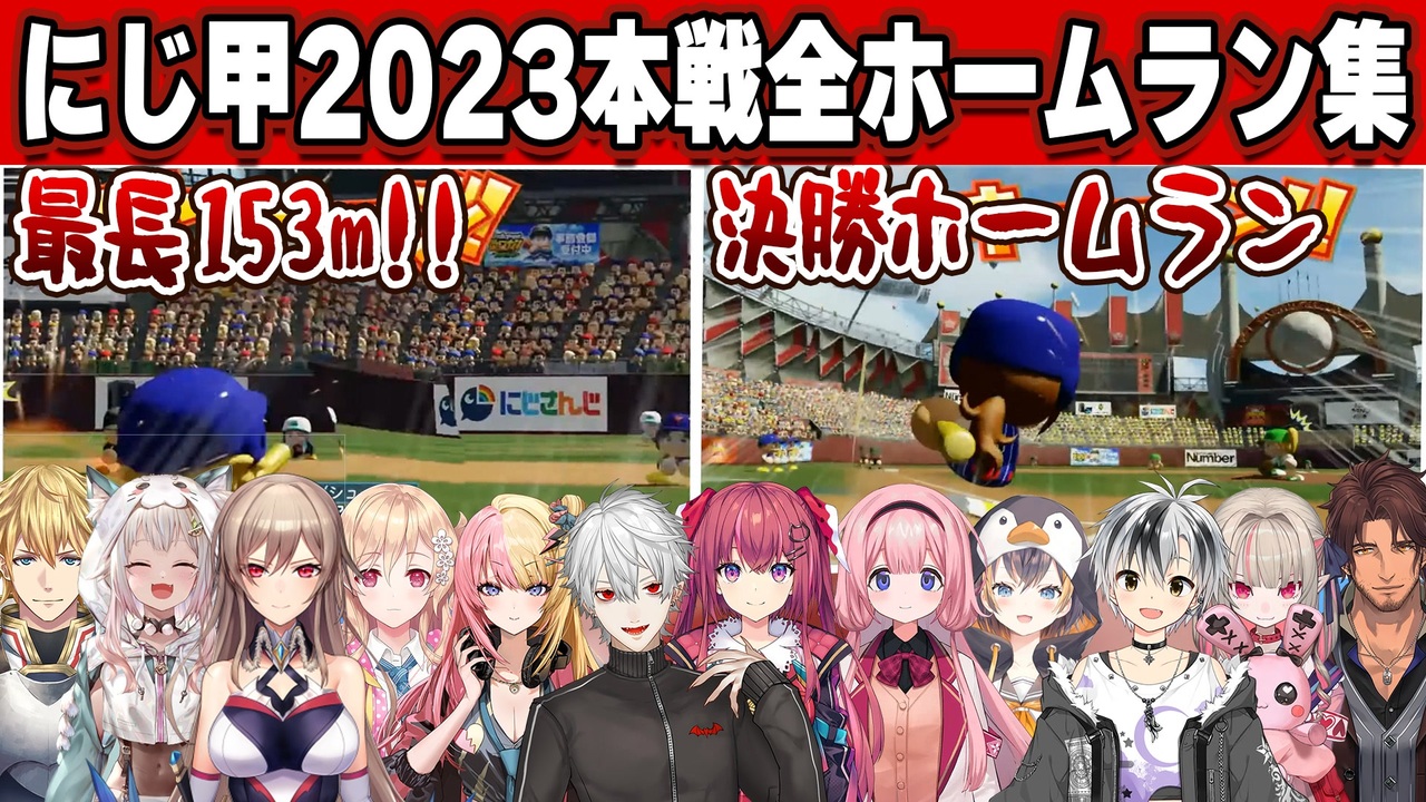対左Fのりりむのホームランが一番おかしかった気がします<br><br><a href="#" class="seekTime" data-seekTime="0:00" onclick="seekNicoPlayer('#0:00'); return false;">#0:00</a> エクス 1号<br><a href="#" class="seekTime" data-seekTime="0:36" onclick="seekNicoPlayer('#0:36'); return false;">#0:36</a> 葉山 1号(エクスに続き二打席連続HR)<br><a href="#" class="seekTime" data-seekTime="1:16" onclick="seekNicoPlayer('#1:16'); return false;">#1:16</a> フレン 1号<br><a href="#" class="seekTime" data-seekTime="1:55" onclick="seekNicoPlayer('#1:55'); return false;">#1:55</a> エクス 2号(史上最大飛距離153m)<br><a href="#" class="seekTime" data-seekTime="2:44" onclick="seekNicoPlayer('#2:44'); return false;">#2:44</a> エクス 3号<br><a href="#" class="seekTime" data-seekTime="3:19" onclick="seekNicoPlayer('#3:19'); return false;">#3:19</a> コトカ 1号<br><a href="#" class="seekTime" data-seekTime="4:00" onclick="seekNicoPlayer('#4:00'); return false;">#4:00</a> 天ヶ瀬 1号<br><a href="#" class="seekTime" data-seekTime="4:38" onclick="seekNicoPlayer('#4:38'); return false;">#4:38</a> 葛葉 1号<br><a href="#" class="seekTime" data-seekTime="5:25" onclick="seekNicoPlayer('#5:25'); return false;">#5:25</a> 獅子堂 1号 <br><a href="#" class="seekTime" data-seekTime="5:50" onclick="seekNicoPlayer('#5:50'); return false;">#5:50</a> 葛葉 2号<br><a href="#" class="seekTime" data-seekTime="6:28" onclick="seekNicoPlayer('#6:28'); return false;">#6:28</a> 明楽 1号<br><a href="#" class="seekTime" data-seekTime="7:07" onclick="seekNicoPlayer('#7:07'); return false;">#7:07</a> ペトラ 1号(先頭打者ホームラン)<br><a href="#" class="seekTime" data-seekTime="7:39" onclick="seekNicoPlayer('#7:39'); return false;">#7:39</a> 鈴木勝 1号<br><a href="#" class="seekTime" data-seekTime="8:12" onclick="seekNicoPlayer('#8:12'); return false;">#8:12</a> サンゴ 1号<br><a href="#" class="seekTime" data-seekTime="8:47" onclick="seekNicoPlayer('#8:47'); return false;">#8:47</a> フレン 2号<br><a href="#" class="seekTime" data-seekTime="9:27" onclick="seekNicoPlayer('#9:27'); return false;">#9:27</a> 天ヶ瀬 2号<br><a href="#" class="seekTime" data-seekTime="9:57" onclick="seekNicoPlayer('#9:57'); return false;">#9:57</a> ベルモンド 1号(決勝ホームラン)<br><a href="#" class="seekTime" data-seekTime="10:39" onclick="seekNicoPlayer('#10:39'); return false;">#10:39</a> りりむ 1号(対左Fホームラン)<br><br>▼元動画はこちら<br>にじさんじ甲子園2023 本戦 Aリーグ<br><a href="https://www.youtube.com/watch?v=71qpxUspJv4" target="_blank" rel="noopener nofollow">https://www.youtube.com/watch?v=71qpxUspJv4</a><br>にじさんじ甲子園2023 本戦 Bリーグ<br><a href="https://www.youtube.com/watch?v=YGOceBQPZi0" target="_blank" rel="noopener nofollow">https://www.youtube.com/watch?v=YGOceBQPZi0</a><br>にじさんじ甲子園2023 決勝【 #にじ甲2023 】<br><a href="https://www.youtube.com/watch?v=rsgHidOpoHw" target="_blank" rel="noopener nofollow">https://www.youtube.com/watch?v=rsgHidOpoHw</a><br><br><br>▼にじさんじ甲子園の監督達<br>〇リゼ・ヘルエスタ<br>〇椎名唯華<br>〇イブラヒム<br>〇渡会雲雀<br>〇社築<br>〇椎名唯華 <br>〇ニュイ・ソシエール<br>〇リゼ・ヘルエスタ <br>〇レオス・ヴィンセント<br>〇樋口楓<br>〇五十嵐梨花 <br>〇剣持刀也(虚空学院)<br><br><br><br><br>