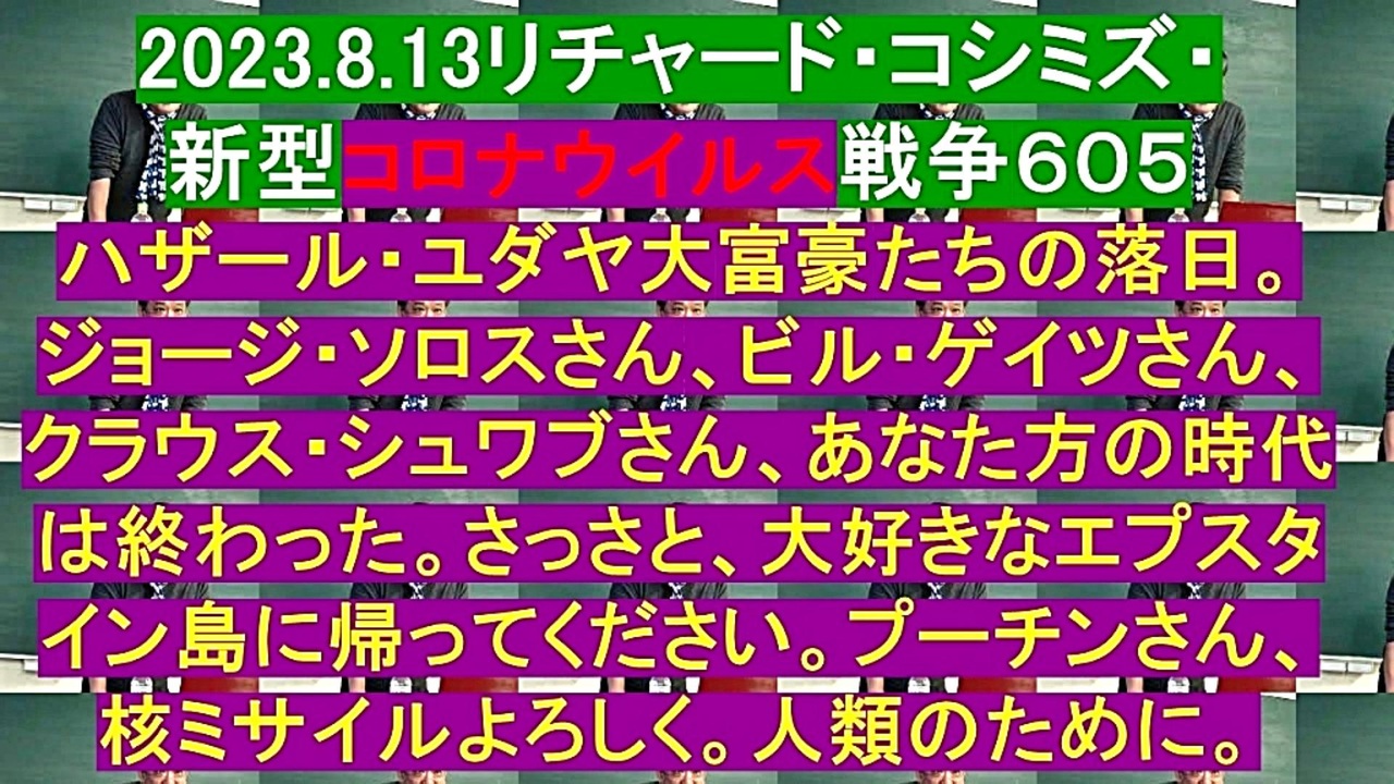 <span style="color: #cc4125;"><strong>「 テーマ : 新型コロナウイルス戦争 605 」</strong></span><br><br><span style="color: #ff0000;"><strong>「『 ハザール・ユダヤ大富豪 』たちの『 落日 』。『 ジョージ・ソロス 』さん、『 ビル・ゲイツ 』さん、<br> 『 クラウス・シュワブ 』さん、『 あなた方 』の『 時代 』は『 終わった 』。さっさと、大好きな『 エ<br> プスタイン島 』に帰ってください。『 プーチン 』さん、『 核ミサイル 』よろしく。『 人類 』のために 」</strong></span><br><br><span style="color: #0000ff;"><strong>「『 イベルメクチン・アビガン・その他コロナ対策 』について、ご意見をお寄せ下さい! 」<br><br> ◐ E-mail:richardkoshimizu@gmail.com</strong></span><br><br><strong>◐「クリエイター・サポート」・「ニコニ広告」・「フォロー」等、ご協力の程宜しくお願い致します。RK</strong><br><br><span style="color: #38761d;"><strong>◐ リチャード・コシミズ 講演会 公式 動画ギャラリー</strong></span><br> <span style="color: #38761d;"><strong><a href="http://www.t-sskk.com/richardkoshimizu/video-gallery/index.html" target="_blank" rel="noopener nofollow">http://www.t-sskk.com/richardkoshimizu/video-gallery/index.html</a><br><br>◐ リチャード・コシミズ 講演会 「 ニコニコ生放送『 LIVE 』」</strong></span><br> <span style="color: #38761d;"><strong><a href="https://bit.ly/3Bx8F5w" target="_blank" rel="noopener nofollow">https://bit.ly/3Bx8F5w</a><br><br>◐ リチャード・コシミズ 『 ニコニコ チャンネル 』</strong></span><br> <span style="color: #38761d;"><strong><a href="https://ch.nicovideo.jp/richardkoshimizu" target="_blank" rel="noopener nofollow">https://ch.nicovideo.jp/richardkoshimizu</a><br><br>◐ リチャード・コシミズ 公式 ブログ</strong></span><br> <span style="color: #38761d;"><strong><a href="http://08054623210.jugem.jp/" target="_blank" rel="noopener nofollow">http://08054623210.jugem.jp/</a></strong></span><br>