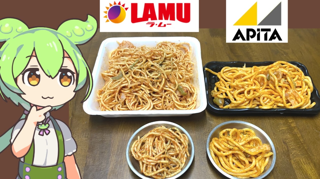 どちらもメニューはナポリタンですが、中身は正反対でした。<br><br><br>【参考】<br>大黒天物産株式会社<br><a href="https://www.e-dkt.co.jp/" target="_blank" rel="noopener nofollow">https://www.e-dkt.co.jp/</a><br>ユニー株式会社<br><a href="https://www.uny.co.jp/" target="_blank" rel="noopener nofollow">https://www.uny.co.jp/</a><br><br><br>【使用した素材】(※敬称略)<br>(合成音声)VOICEVOX/ずんだもん/四国めたん/<br><a href="https://voicevox.hiroshiba.jp/" target="_blank" rel="noopener nofollow">https://voicevox.hiroshiba.jp/</a><br>(立ち絵)坂本アヒル<br><a href="https://seiga.nicovideo.jp/seiga/im10788496" target="_blank" rel="noopener">im10788496</a>/<a href="https://seiga.nicovideo.jp/seiga/im10791276" target="_blank" rel="noopener">im10791276</a><br>(楽曲)甘茶の音楽工房/「楽しい麦畑」「フルーツパフェ」<br><a href="https://amachamusic.chagasi.com/" target="_blank" rel="noopener nofollow">https://amachamusic.chagasi.com/</a><br><br><br>【関連動画】<br>ずんだもんとラ・ムーで買った「中身が見えない198円のお弁当」<br><a href="https://www.youtube.com/watch?v=9kwijL0_RwA&t=63s" target="_blank" rel="noopener nofollow">https://www.youtube.com/watch?v=9kwijL0_RwA&t=63s</a><br><br>