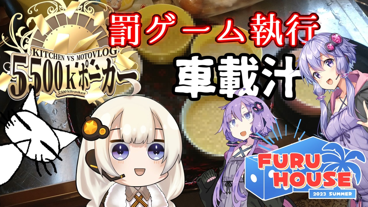 この動画は横沢さわらさん主催<span style="font-size: 16px;"><strong>【</strong></span><span style="color: #ff0000; font-size: 16px;"><strong>5500kポーカー</strong></span><span style="font-size: 16px;"><strong>】</strong></span>罰ゲーム執行動画です。<br><span style="font-size: 16px;"><strong>まだ未視聴の方はこちら→<a href="https://www.nicovideo.jp/mylist/74491570" target="_blank" rel="noopener">mylist/74491570</a>【5500kポーカー参加者マイリスト】</strong></span><br><br>9月1日から始まります【FURU HOUSE】に先駆け<br>車載チームがおみまいした車載汁の製作動画になります(゚∀゚)<br><br>食べれないものは使ってないので出来たものは受刑sy…<br>キッチンチームと勇気ある食客の皆様で残さず食べていただきました( ^ω^ 三 ^ω^ )<br><br>横沢さわらさん同時投稿の受刑動画<br>キッチンチームサイド→<a href="https://www.nicovideo.jp/watch/sm42650221" class="watch">sm42650221</a><br><br>FURU HOUSE告知動画→<a href="https://www.nicovideo.jp/watch/sm42632235" class="watch">sm42632235</a><br><br>【FURU HOUSE】動画(敬称略)<br>1日目 朝食ペア<br> GAEA00→<a href="https://www.nicovideo.jp/watch/sm42694166" class="watch">sm42694166</a> / 横沢さわら→<a href="https://www.nicovideo.jp/watch/sm42689736" class="watch">sm42689736</a><br><br>1日目 昼食ペア<br> ますみ→<a href="https://www.nicovideo.jp/watch/sm42708480" class="watch">sm42708480</a> / ななのへ→<a href="https://www.nicovideo.jp/watch/sm42709502" class="watch">sm42709502</a><br> 前半実況きよたか→<a href="https://www.nicovideo.jp/watch/sm42643611" class="watch">sm42643611</a><br><br>1日目 夕食ペア<br> とりけん→これ / ふろフタ→<a href="https://www.nicovideo.jp/watch/sm42713515" class="watch">sm42713515</a><br><br>2日目朝食ペア<br> ルズムーン→<a href="https://www.nicovideo.jp/watch/sm42713795" class="watch">sm42713795</a> / Tera→<a href="https://www.nicovideo.jp/watch/sm42711720" class="watch">sm42711720</a><br> 後半実況あくまき→<a href="https://www.nicovideo.jp/watch/sm42697990" class="watch">sm42697990</a><br><br>使用BGM<br>思春期ガールズ・オン・ザ・ラン!/ウサギ屋の音楽室 様<br><br>