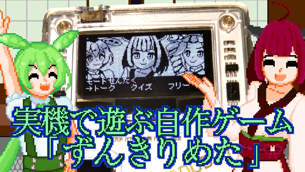 今回はArduboy用に作成したきりたんやずんだもん、めたんが登場する自作ゲーム「ずんきりめた」の紹介する動画です<br>前半はArduboyの説明後半は実際に撮影した実機プレイの映像になってます<br><br><br><strong>ゲームは下記のURLからPCでもスマホでもブラウザで遊ぶ事ができます!<br><a href="https://felipemanga.github.io/ProjectABE/?url=https://community.arduboy.com/uploads/short-url/k4ZA8rinc0iwgO2Y8AwipeVfvhq.hex" target="_blank" rel="noopener nofollow">https://felipemanga.github.io/ProjectABE/?url=https://community.arduboy.com/uploads/short-url/k4ZA8rinc0iwgO2Y8AwipeVfvhq.hex</a></strong><br><br>ずんきりめたの操作方法<br>・メインメニュー<br>←→項目の選択<br>AB項目の決定キャンセル<br><br>・トークモード<br>A会話を進める<br>B長押しでトークモード終了の会話になる<br><br>・クイズモード<br>←→答えの選択<br>A答えの決定<br><br>・フリーモード<br>←→動かすキャラクターの選択<br>↑目を丸くする<br>↓目を閉じる<br>A口を開く<br>B口をパクパク開く<br>ABを同時に長く押すとメインメニューに戻る<br><br><br><br><br>動画使用素材<br>M-ART Napi様:<a href="http://mart.kitunebi.com/index.html" target="_blank" rel="noopener nofollow">http://mart.kitunebi.com/index.html</a><br>VOICEVOX <a href="https://voicevox.hiroshiba.jp/" target="_blank" rel="noopener nofollow">https://voicevox.hiroshiba.jp/</a>