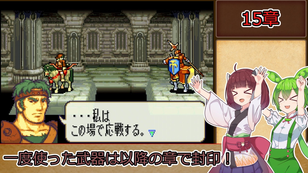 <span style="color: #85200c; font-size: 24px;"><strong><i>語りイタチをお供に旅する風来人</i></strong></span><br><br><strong>ルール1:一度使用した武器種は、以降の章で使用する事を禁止する。<br>ルール2:武器の使用の定義は『その武器を装備した状態で敵との戦闘が発生したタイミング』『その武器を売却して換金した場合』杖の場合は『対象に対して使用した時点(命中の可否は問わない)』とする。</strong><br><span style="color: #ff0000;"><strong>※同盟軍、演出による戦闘イベントでは使用した判定にはならないこととする。</strong></span><br><strong>ルール3:難易度はリン編ハード→ヘクトル編ハードとする。<br>ルール4:序章から終章まで外伝、異伝を含む全ての章を攻略し、仲間に出来るユニットは全員加入させ、生存させる。(序章と1章のみ同一の章として扱う)</strong><br><span style="color: #ff0000; font-size: 18px;"><strong>※バグ技禁止</strong></span><br><br>本動画のシリーズリスト【<a href="https://www.nicovideo.jp/series/406473" target="_blank" rel="noopener">series/406473</a>】<br>前作の同縛りプレイ【<a href="https://www.nicovideo.jp/series/316824" target="_blank" rel="noopener">series/316824</a>】<br>前:【<a href="https://www.nicovideo.jp/watch/sm42636705" class="watch">sm42636705</a>】次:【<a href="https://www.nicovideo.jp/watch/sm42716880" class="watch">sm42716880</a>】<br><br><strong>使用したソフト</strong><br>VOICEROID+東北きりたんEX<br>VOICEPEAK 東北きりたん<br>VOICEPEAK ずんだもん<br><strong>お借りした素材</strong><br>ニコニコモンズの皆様(コンテンツツリー参照)