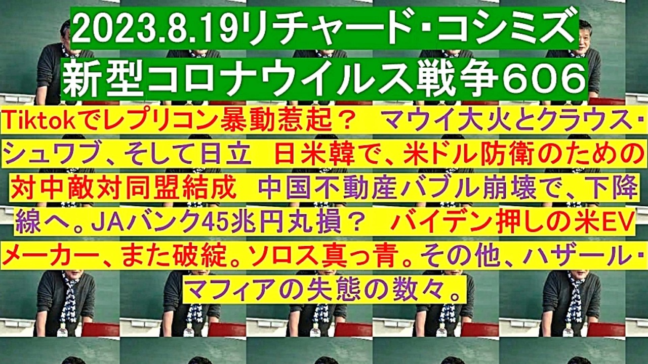 <span style="color: #cc4125;"><strong>「 テーマ : 新型コロナウイルス戦争 606 」</strong></span><br><br><span style="color: #ff0000;"><strong>「『 TikTok 』で『 レプリコン暴動惹起 』?『 マウイ大火 』と『 クラウス・シュワブ 』、そして<br> 『 日立 』。『 日米韓 』で、『 米ドル防衛 』のための『 対中敵対同盟結成 』。『 中国不動産バ<br> ブル崩壊 』で、『 下降線 』へ。『 JAバンク、45兆円丸損 』?『 バイデン 』押しの『 米EVメ<br> ーカー 』、また『 破綻 』。『 ソロス、真っ青 』。その他、『 ハザール・マフィア 』の『 失態の<br> 数々 』」</strong></span><br><br><span style="color: #0000ff;"><strong>「『 イベルメクチン・アビガン・その他コロナ対策 』について、ご意見をお寄せ下さい! 」<br><br> ◐ E-mail:richardkoshimizu@gmail.com</strong></span><br><br><strong>◐「クリエイター・サポート」・「ニコニ広告」・「フォロー」等、ご協力の程宜しくお願い致します。RK</strong><br><br><span style="color: #38761d;"><strong>◐ リチャード・コシミズ 講演会 公式 動画ギャラリー</strong></span><br> <span style="color: #38761d;"><strong><a href="http://www.t-sskk.com/richardkoshimizu/video-gallery/index.html" target="_blank" rel="noopener nofollow">http://www.t-sskk.com/richardkoshimizu/video-gallery/index.html</a><br><br>◐ リチャード・コシミズ 講演会 「 ニコニコ生放送『 LIVE 』」</strong></span><br> <span style="color: #38761d;"><strong><a href="https://bit.ly/3Bx8F5w" target="_blank" rel="noopener nofollow">https://bit.ly/3Bx8F5w</a><br><br>◐ リチャード・コシミズ 『 ニコニコ チャンネル 』</strong></span><br> <span style="color: #38761d;"><strong><a href="https://ch.nicovideo.jp/richardkoshimizu" target="_blank" rel="noopener nofollow">https://ch.nicovideo.jp/richardkoshimizu</a><br><br>◐ リチャード・コシミズ 公式 ブログ</strong></span><br> <span style="color: #38761d;"><strong><a href="http://08054623210.jugem.jp/" target="_blank" rel="noopener nofollow">http://08054623210.jugem.jp/</a></strong></span>