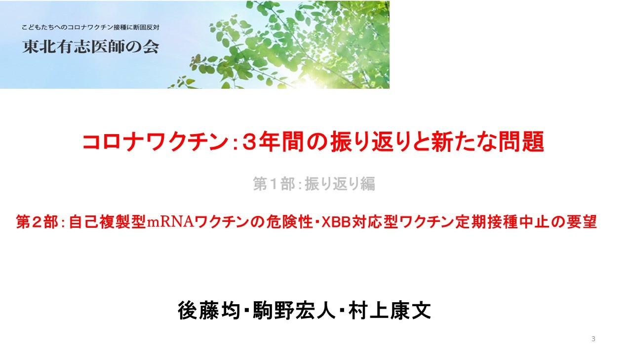 【R5.9最新対談動画】コロナワクチン 3年間の振り返りと新たな問題 第2部<br>~自己複製型mRNAワクチンの危険性・XBB対応型ワクチン定期接種中止の要望~<br>(投稿日8月21日 公開日9月2日)<br><br>村上康文<br>東京理科大学 名誉教授<br><a href="https://www.yasufumimurakami-official.com" target="_blank" rel="noopener nofollow">https://www.yasufumimurakami-official.com</a><br><br>後藤均(東北有志医師の会 代表)<br>ごとう整形外科 手外科クリニック 院長<br><a href="https://karyukai.jp" target="_blank" rel="noopener nofollow">https://karyukai.jp</a><br><br>駒野宏人(東北有志医師の会)<br>薬学博士、認知症・神経科学専門<br><a href="https://brainfitness-coaching.net" target="_blank" rel="noopener nofollow">https://brainfitness-coaching.net</a><br><br>【チャプター】<br><a href="#" class="seekTime" data-seekTime="0:00" onclick="seekNicoPlayer('#0:00'); return false;">#0:00</a> 自己複製型mRNAワクチンの危険性<br><a href="#" class="seekTime" data-seekTime="24:58" onclick="seekNicoPlayer('#24:58'); return false;">#24:58</a> XBB対応型ワクチン定期接種中止の要望<br><a href="#" class="seekTime" data-seekTime="36:30" onclick="seekNicoPlayer('#36:30'); return false;">#36:30</a> まとめ<br><br>【第1部はこちら】<br>「コロナワクチン 3年間の振り返りと新たな問題 第1部 ~3年間の振り返り~」<a href="https://www.nicovideo.jp/watch/sm42662579" target="_blank" rel="noopener nofollow">https://www.nicovideo.jp/watch/sm42662579</a><br><br>【ダイジェスト版】「9月20日から開始されるXBB対応型ワクチンの危険性」<a href="https://www.nicovideo.jp/watch/sm42653350" target="_blank" rel="noopener nofollow">https://www.nicovideo.jp/watch/sm42653350</a><br><br><東北有志医師の会><br>■ホームページ:<a href="https://tohokuishi.localinfo.jp/" target="_blank" rel="noopener nofollow">https://tohokuishi.localinfo.jp/</a><br>■Twitter:<a href="https://twitter.com/tohokuyushiishi" target="_blank" rel="noopener nofollow">https://twitter.com/tohokuyushiishi</a><br>■Facebook:<a href="https://www.facebook.com/tohokuyushiishi" target="_blank" rel="noopener nofollow">https://www.facebook.com/tohokuyushiishi</a><br>■Instagram:<a href="https://www.instagram.com/tohokuishi/" target="_blank" rel="noopener nofollow">https://www.instagram.com/tohokuishi/</a><br>■ニコニコ動画:<a href="https://www.nicovideo.jp/user/124160257" target="_blank" rel="noopener nofollow">https://www.nicovideo.jp/user/124160257</a><br>■YouTube:<a href="https://www.youtube.com/@user-pj5zm9hb4x" target="_blank" rel="noopener nofollow">https://www.youtube.com/@user-pj5zm9hb4x</a><br>■stand fm:<a href="https://stand.fm/channels/623755237cd..." target="_blank" rel="noopener nofollow">https://stand.fm/channels/623755237cd...</a><br><br>